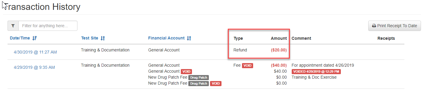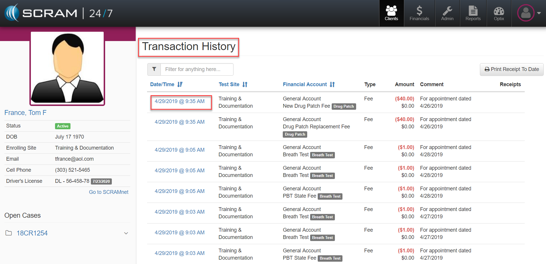 To void an individual client’s transaction, please search and select the client and then navigate to the clients Financials tab. From there you will see a listing of the Client’s Transaction History. Locate and select the specific transaction that needs to be voided either by filtering or just by clicking on the transaction Date/Time stamp listed.
