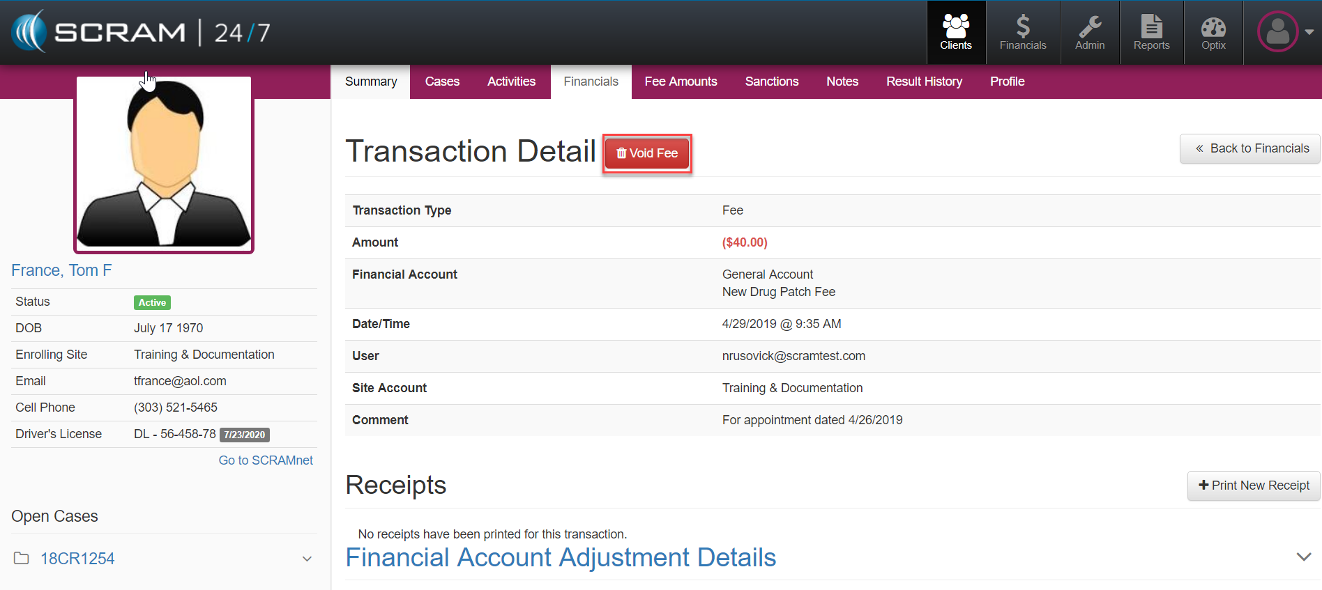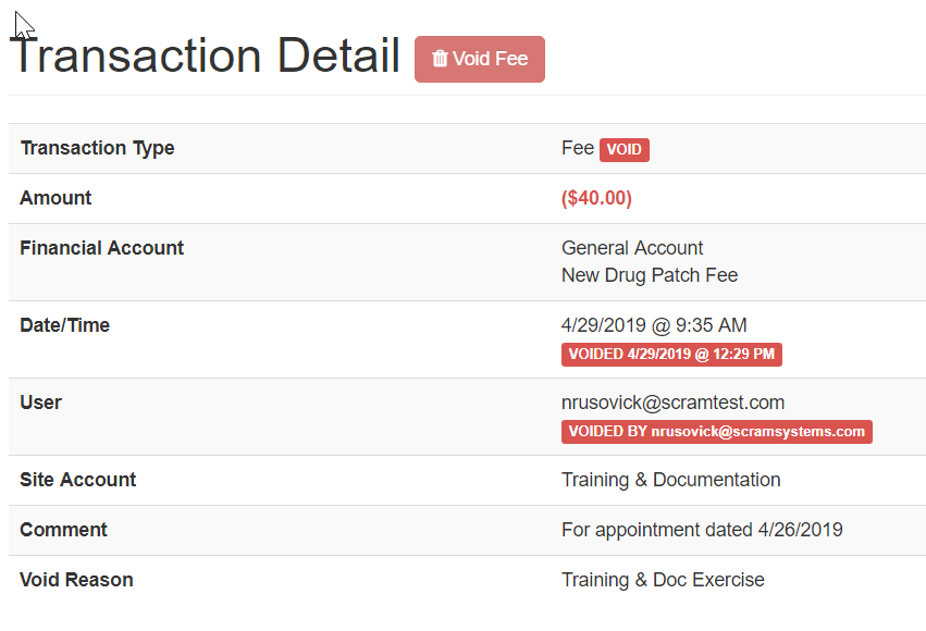 The Transaction Detail will be automatically updated to represent the fee voided and time and user who executed the action.