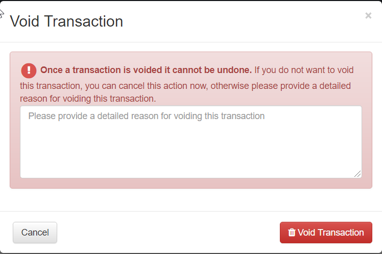 Once selected, the Transaction Detail page will load where the red Void Fee button can be selected to remove the fee. A Void Transaction confirmation popup will display to confirm the operation and to add any notes describing the rationale for voiding the fee.