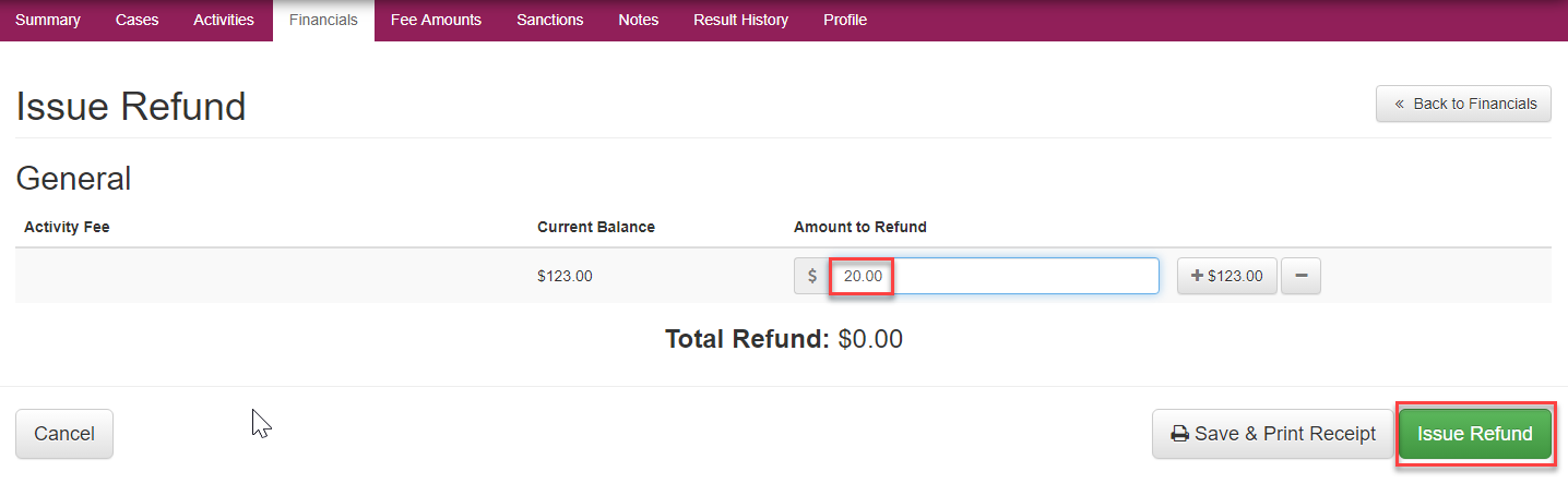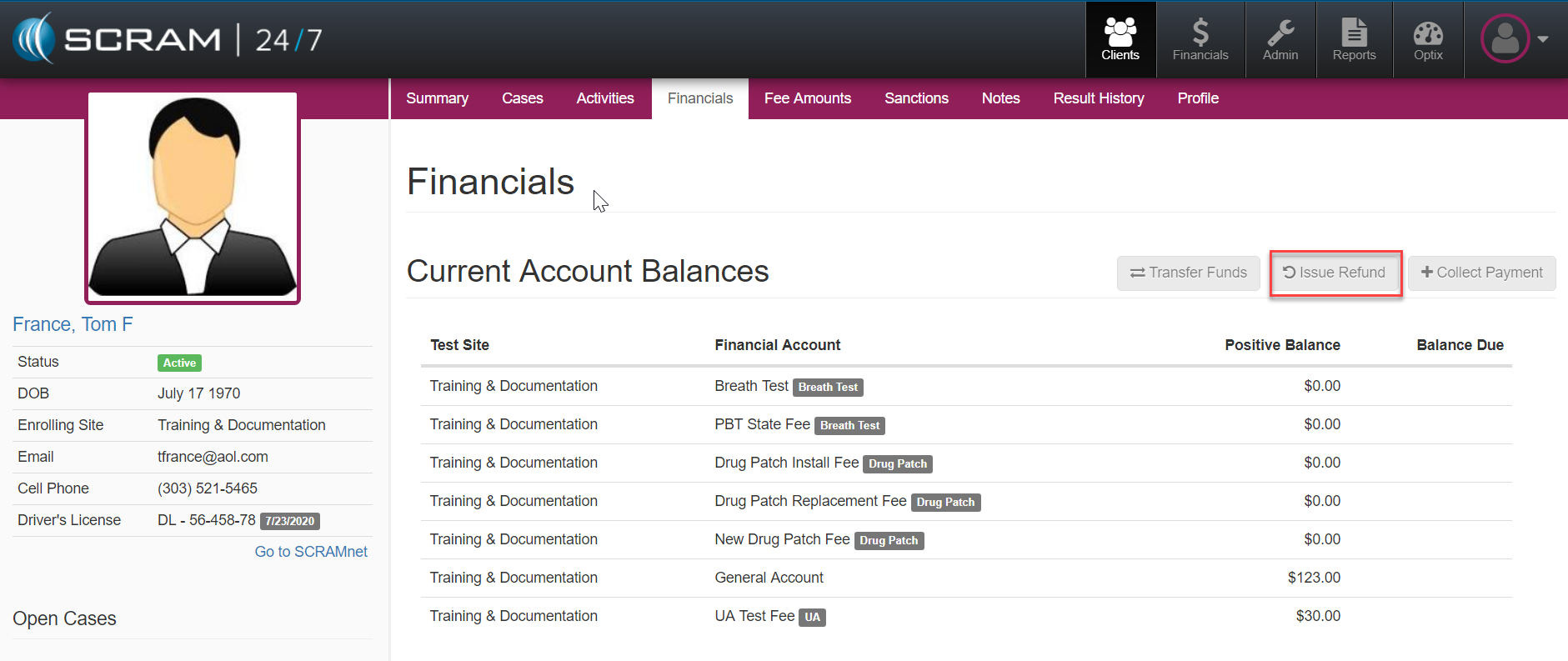 To issue a refund, search and select client and navigate to the individual client’s Financials tab. From the Current Account Balances menu, select the Issue Refund button.