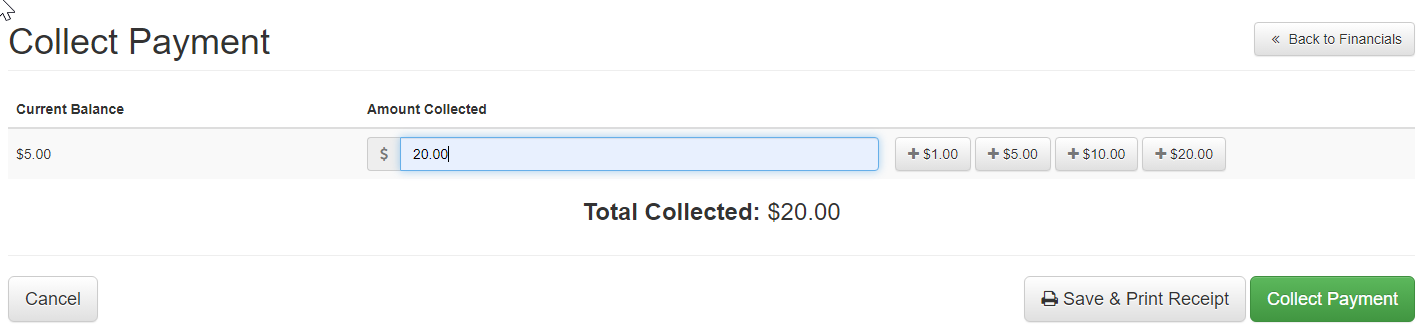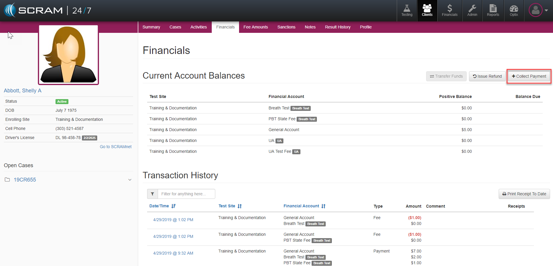 An alternate option for collecting payment exists from the Client’s Financials tab. Once on the page, officers can simply select the +Collect Payment button.
