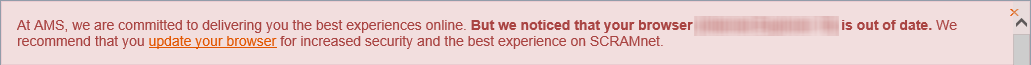 Our two client management sites, SCRAMNET and SCRAMNET GPS, use a variety of modern browser techniques including JavaScript. This functionality must remain enabled in the browser for the application to function correctly. Although all reasonable efforts are made to test application changes on a variety of browsers, AMS cannot guarantee the look, performance, or functionality of either site on any specific browser version beyond the explicitly stated browsers and versions. The following message will appear if you attempt to access either site using an outdated browser.