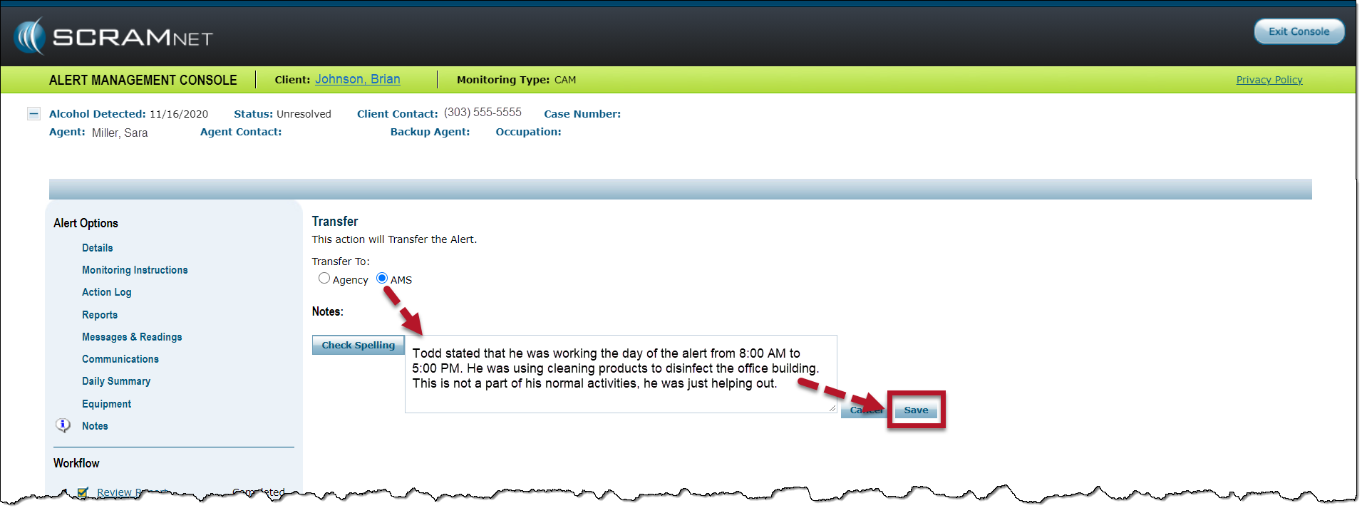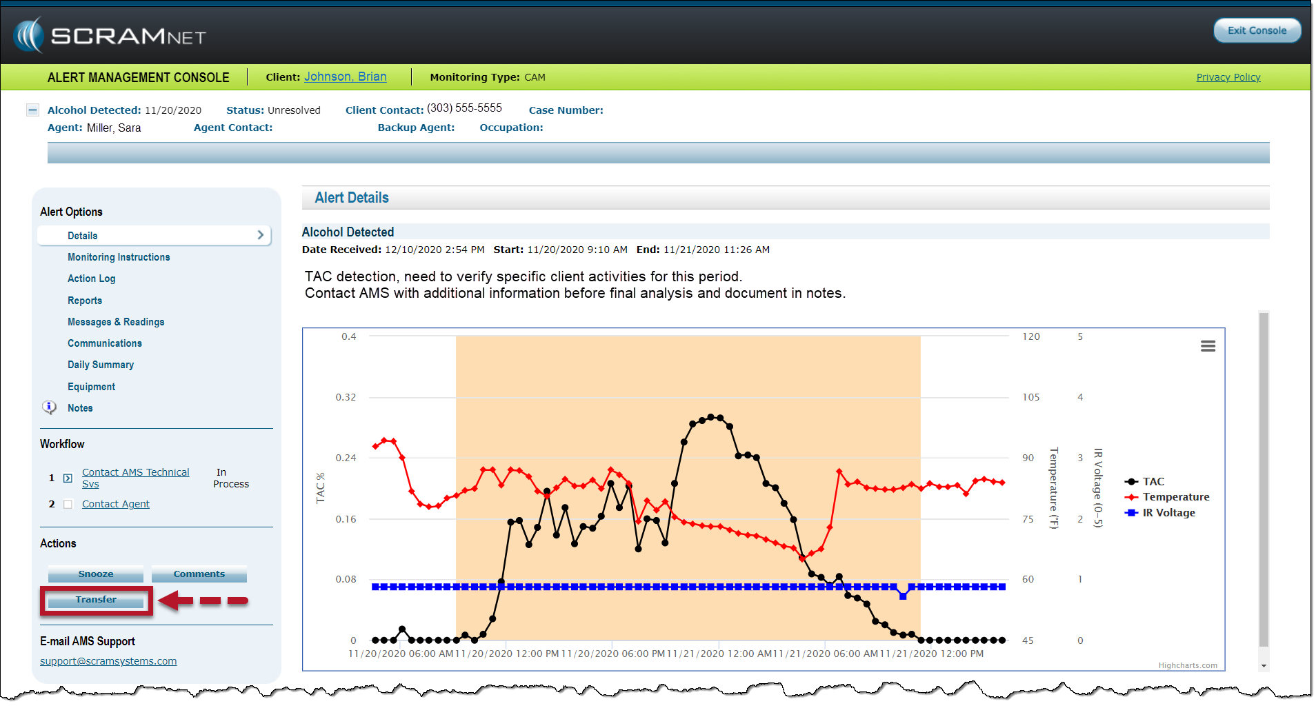 - Once you have the requested information or completed the task, navigate to the alert’s AMC and select the Transfer button.