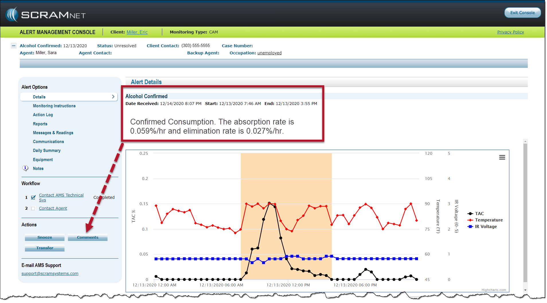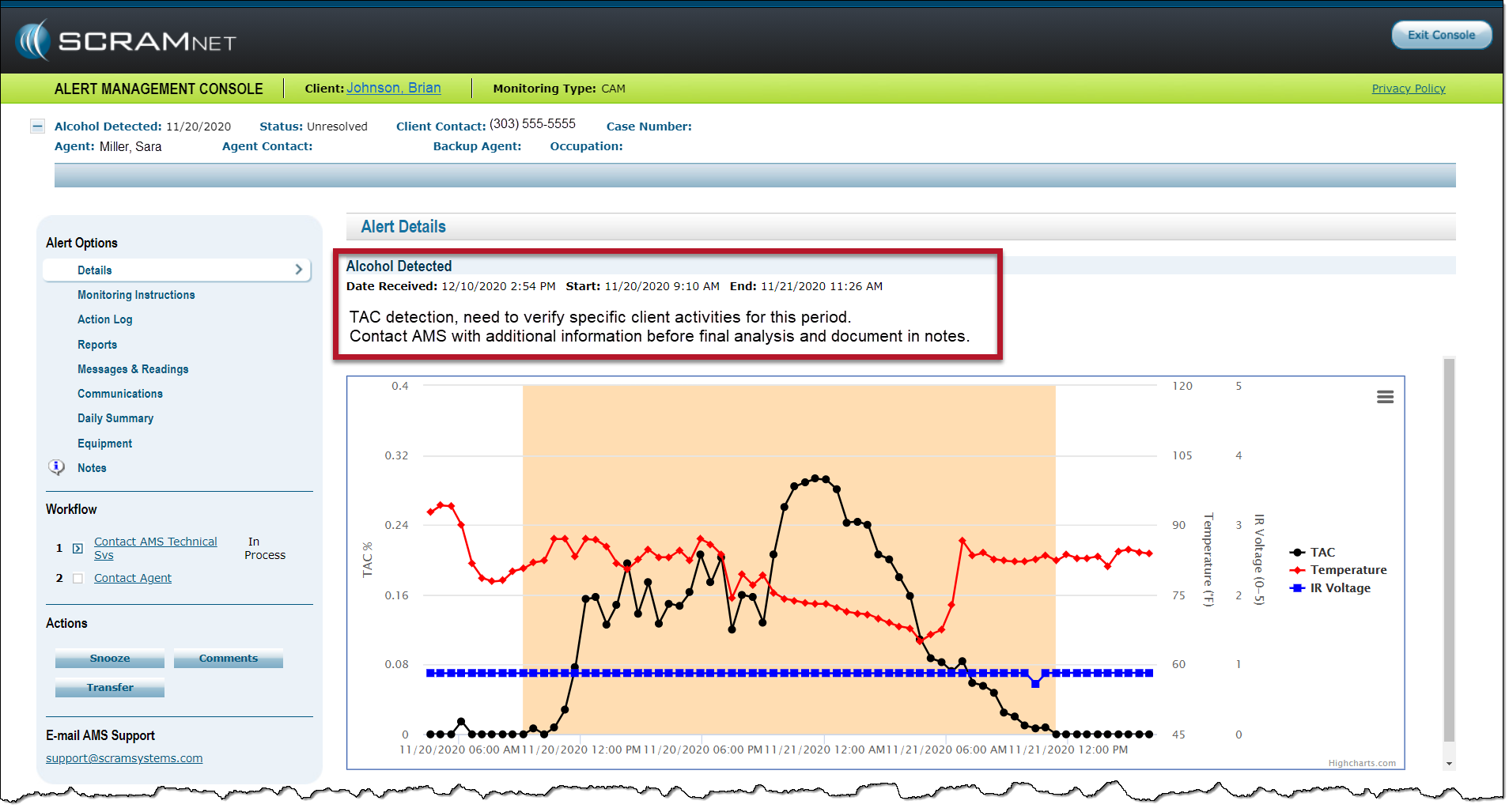 The SCRAM Systems secure data analyzer first analyzes all readings received by the SCRAM CAM bracelet. The data analyzer will flag all readings that meet the alert generation criteria. These flagged readings generate an alert in SCRAMNET. Once flagged, your Data Analyst will analyze the data. They are specially trained and certified to interpret the information provided for each positive alert.