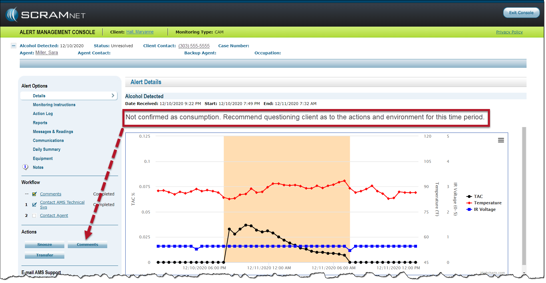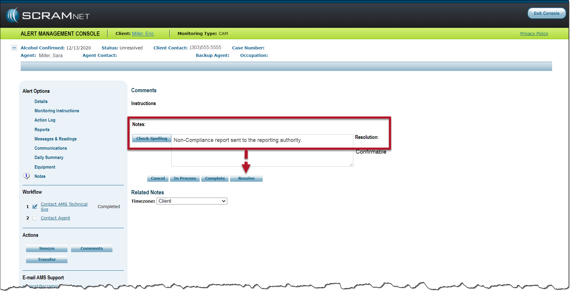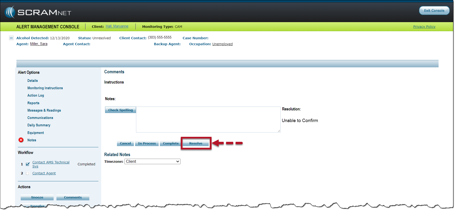 | If at any time the client admits to consuming alcohol during the timeframe of a Not Confirmed event, follow the instructions provided in the “In Process” Alert section. DO NOT RESOLVE THE ALERT.