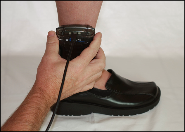 - Place the bracelet no more than an index finger above the right or left ankle with the SERIAL NUMBER FACING UP.