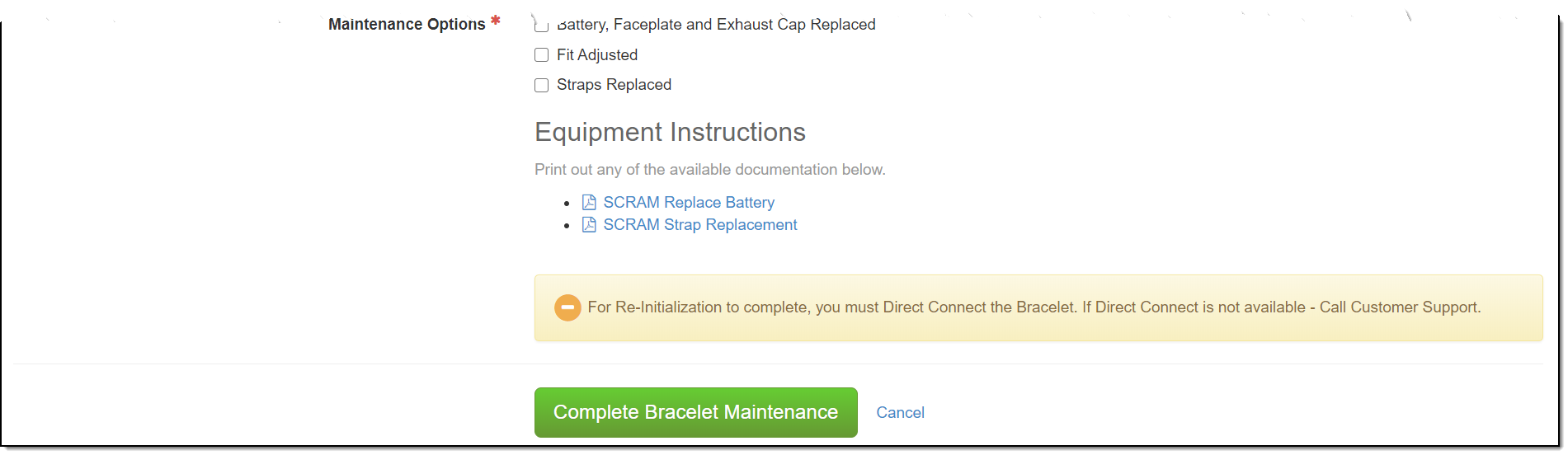 - Click the Complete Bracelet Maintenance button.