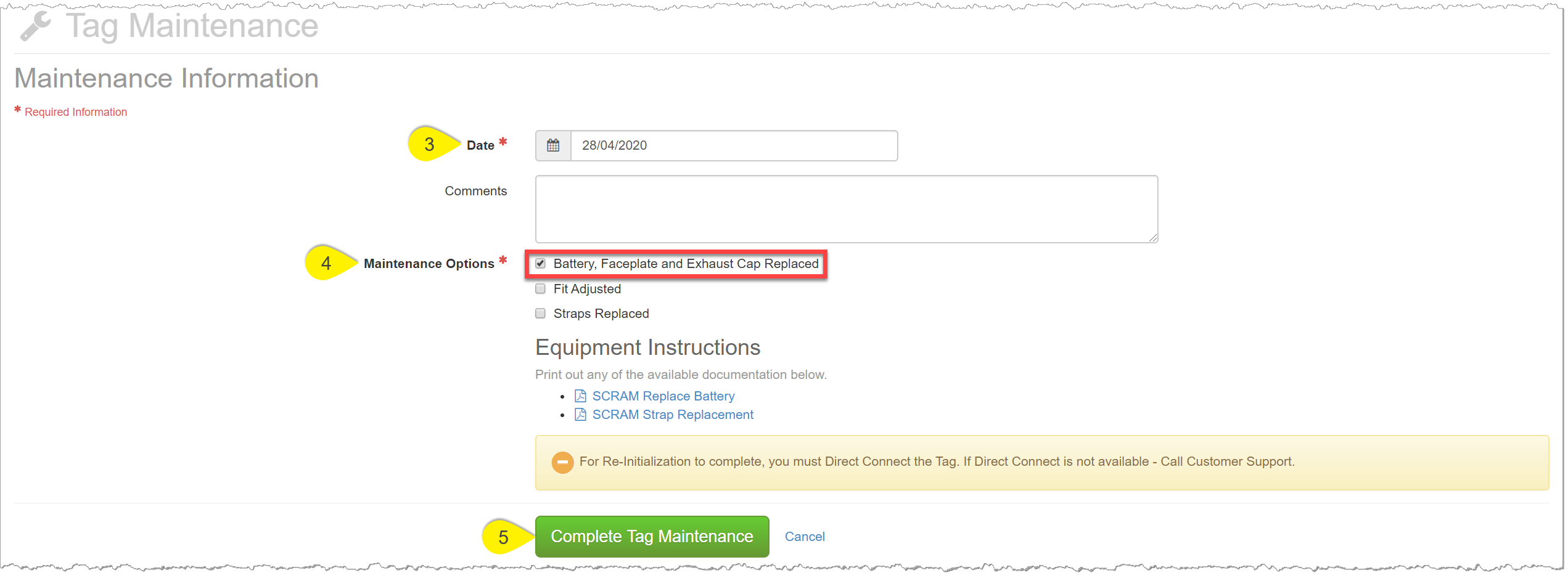 Always follow up any maintenance you perform on the tag by navigating to the Equipment page for the subject in SCRAMNET and clicking the Maintenance link next to the tag’s information.