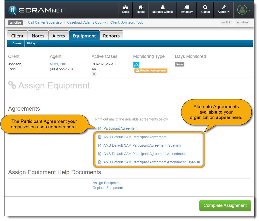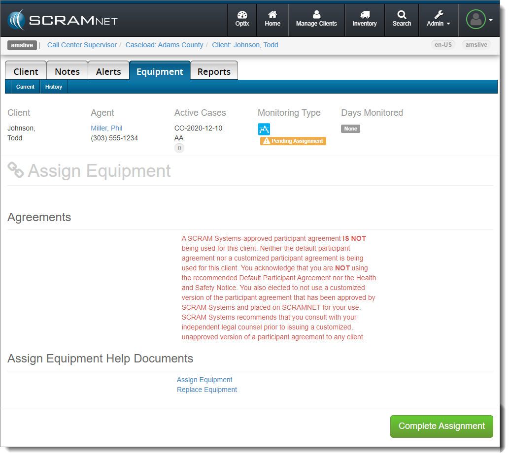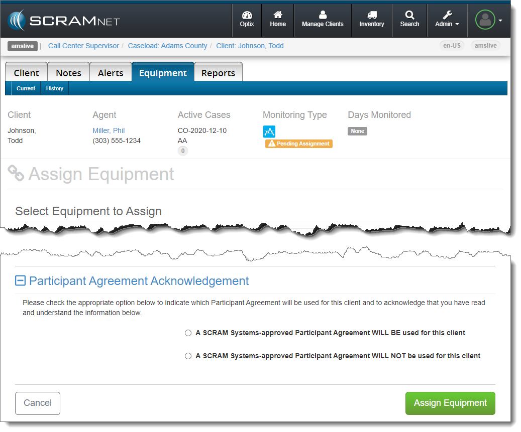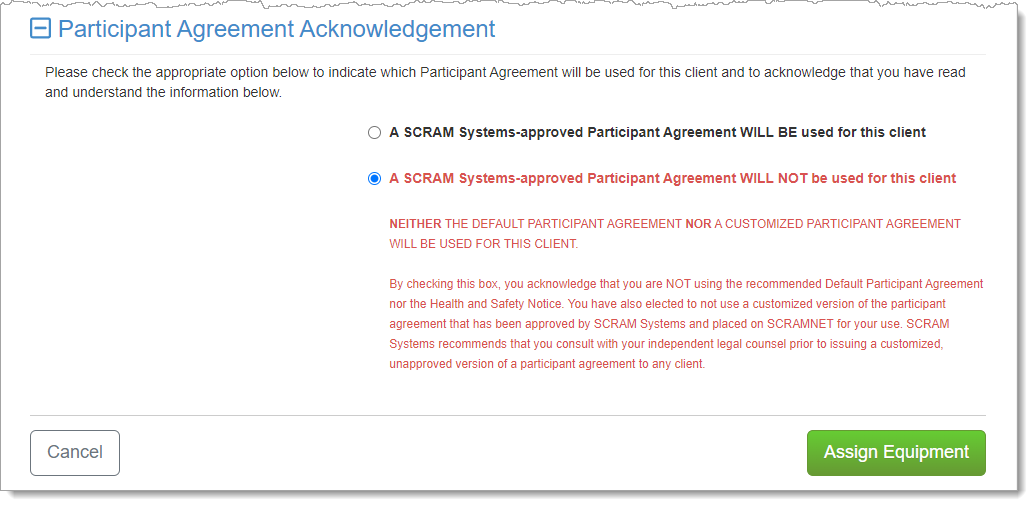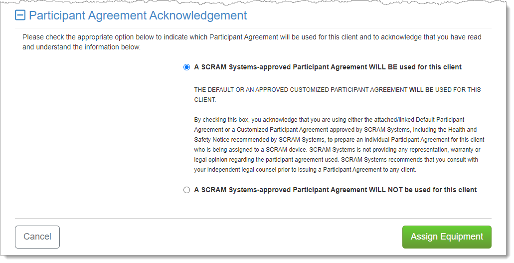 When it is time to assign equipment after adding your client to SCRAMNET, before you may continue with the assignment process, you will have to make a “Participant Agreement Acknowledgement.” The addition of this acknowledgement to the enrollment process grew out of a need for better recordkeeping. It is simply a record of which Agreement is being used at the time of enrollment and does not impact the support you receive from SCRAM Systems.