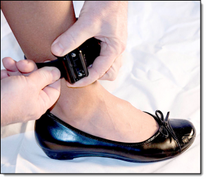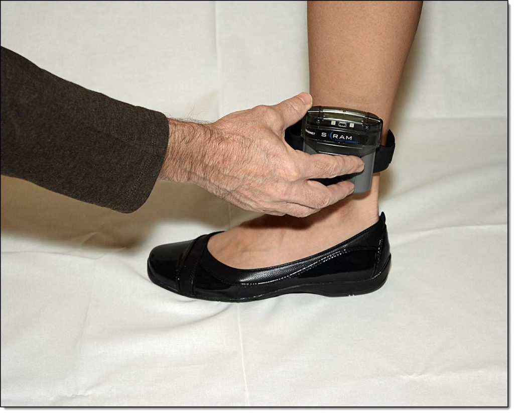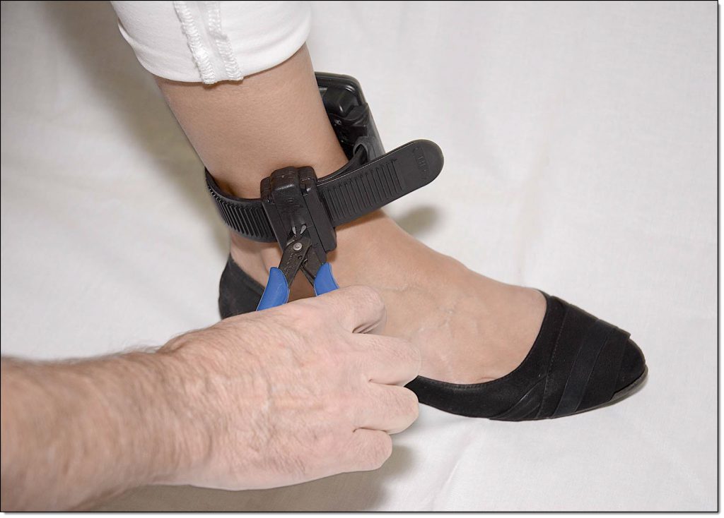 - Pull the strap back through the buckle, removing the bracelet from the client’s ankle.