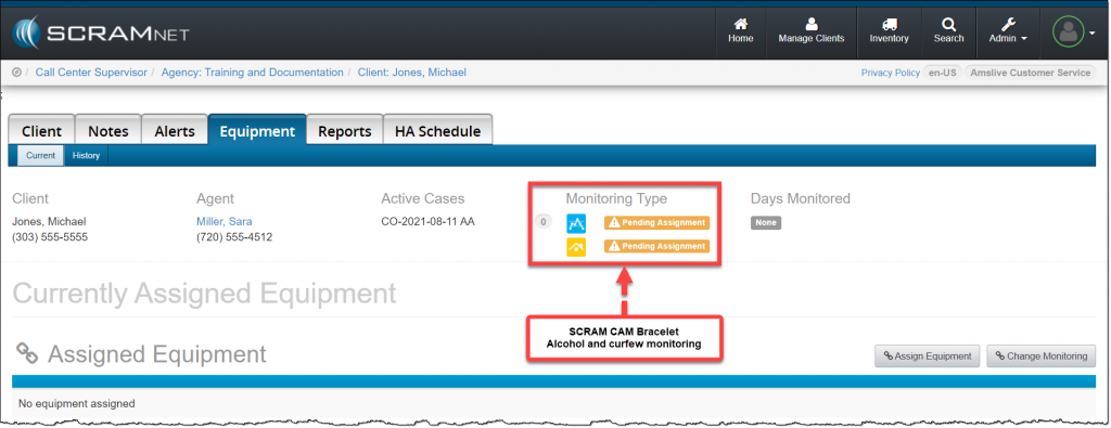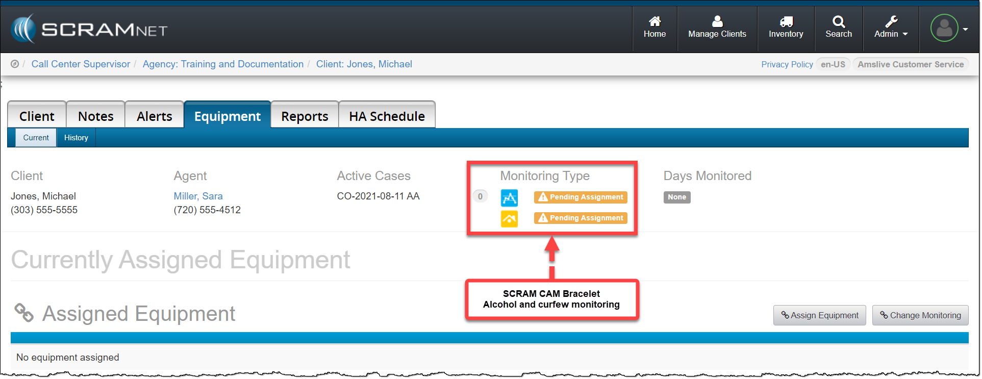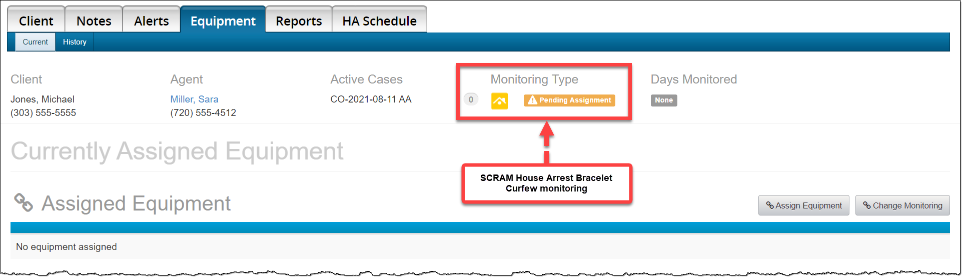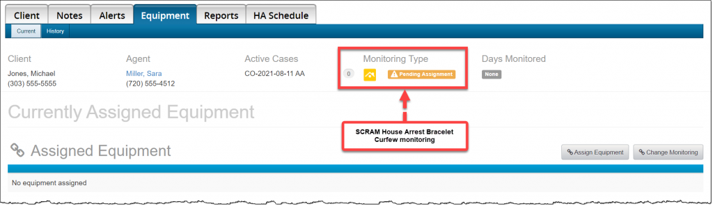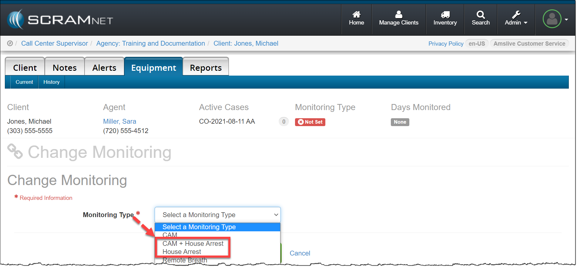 On the client’s Equipment page, the next step is to select the monitoring type for the client. Depending on your program, the options available for house arrest (curfew) monitoring are: