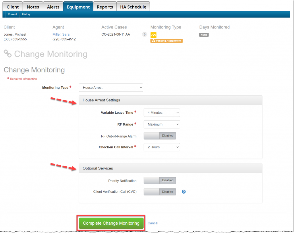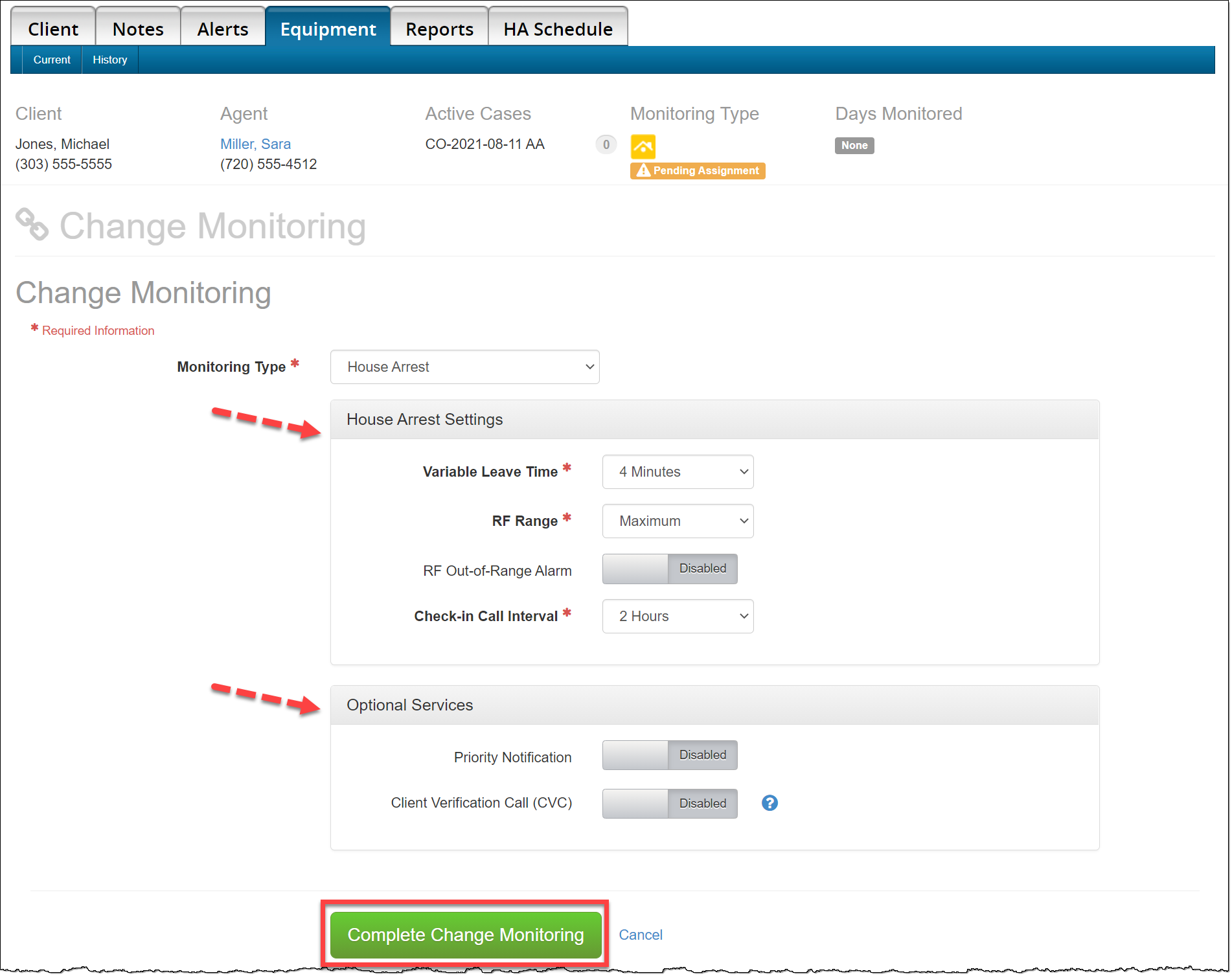 - In the House Arrest Settings section, verify/update the settings for the client.