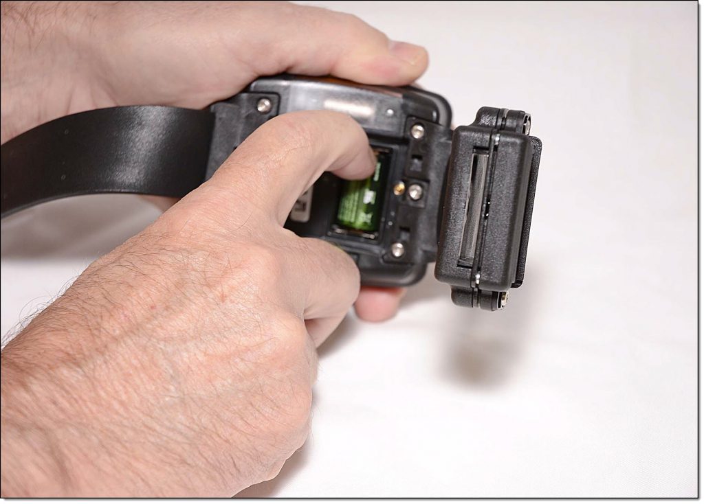 - Look closely for the outline of a battery at the bottom of the battery slot and insert the battery, starting with the positive side being pushed against the bottom side of the battery slot and pushing down on the negative (flat) side, which faces up towards the serial number.