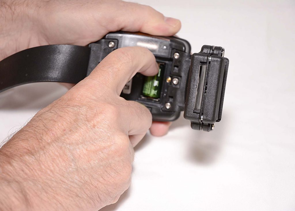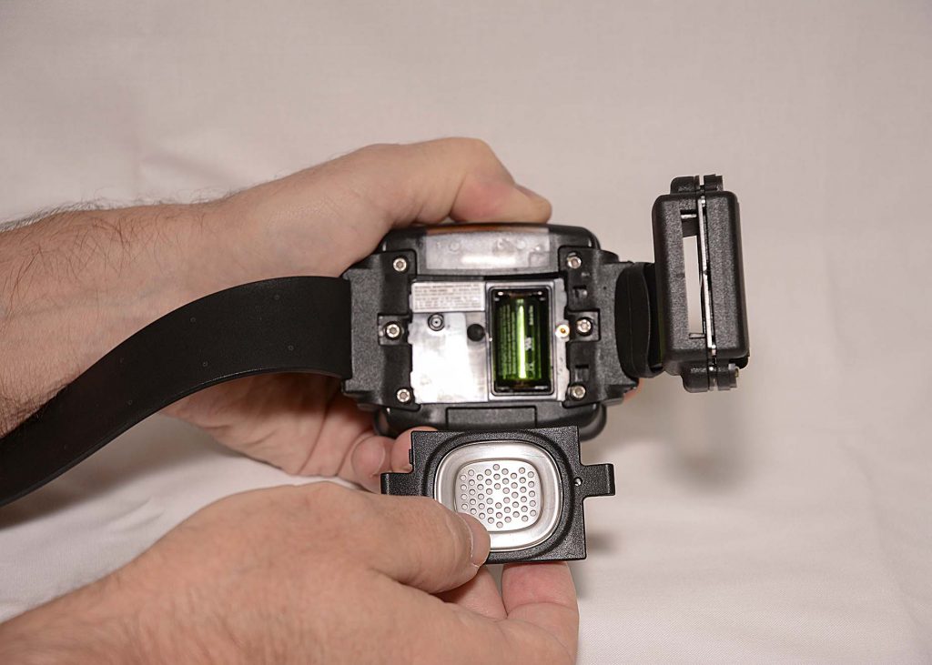 The pogo pins and battery contacts should be cleaned any time that the straps are removed. To clean the components using the AMS-approved brush and cloth or equivalent (fine-bristled brush and microfiber cloth):