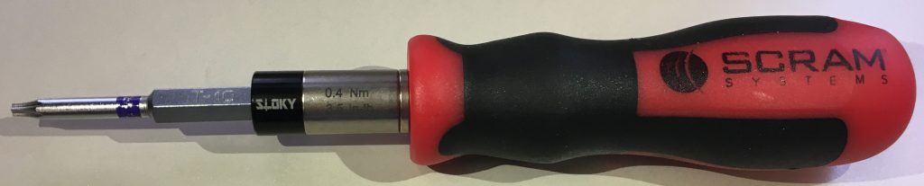 - Using the Torx screwdriver provided by SCRAM Systems®, remove the two outside Torx screws then remove the middle screw.