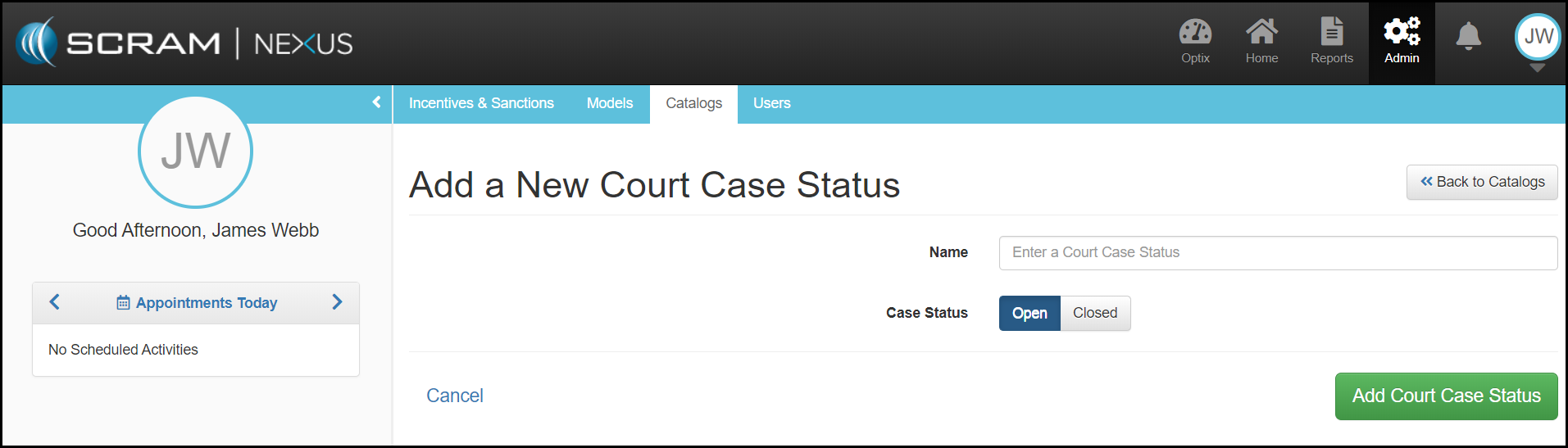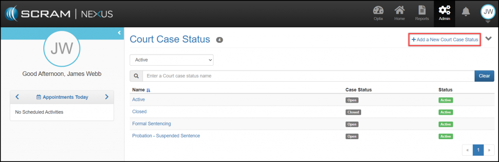 The Add a New Court Case Status page allows an administrator to define a new Case Status and indicate whether the new case type is Open or Closed.