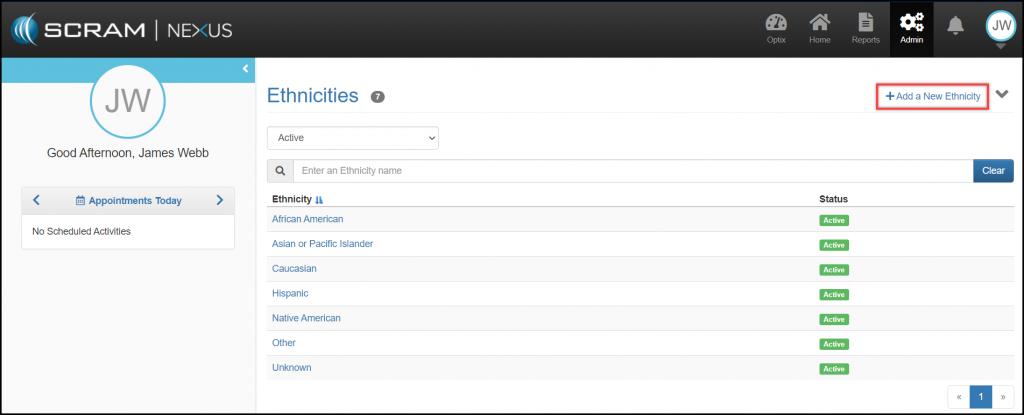 The Ethnicity section allows the department to define the ethnicity category of clients who are enrolled in the program. An ethnicity category can be added to this section through the Add a New Ethnicity button.