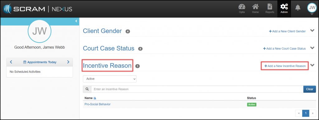 Administrators in SCRAM Nexus can create and manage a catalog of Incentive Reasons an officer may use to assign on-demand Incentive to their clients. This catalog is independent of Incentives that can be assigned for supervision activities. Examples of this include “Pro-Social Behavior” or “Helping Out a Peer.”