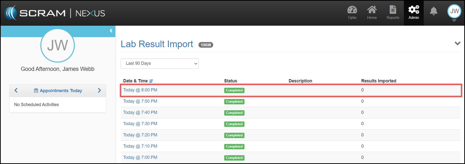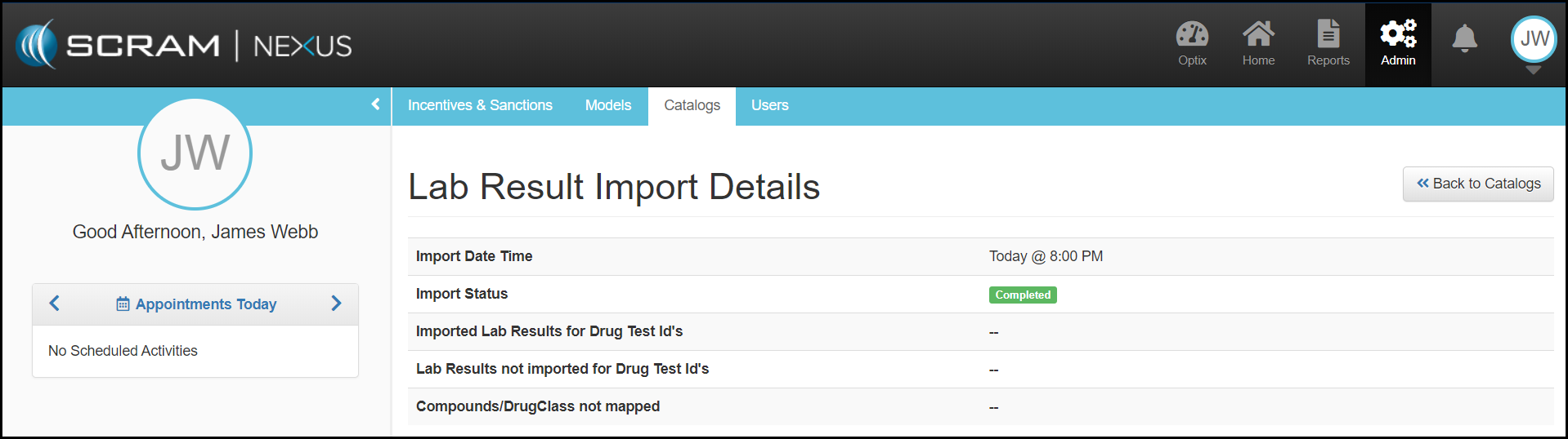 The Lab Result Import feature is designed to provide a real-time status view of the drug tests that have been imported to Nexus from the toxicology lab. If your department is set up to import drug lab tests automatically, the Lab Result Import section will list the results of the import process.  All successful and unsuccessful import attempts are listed.