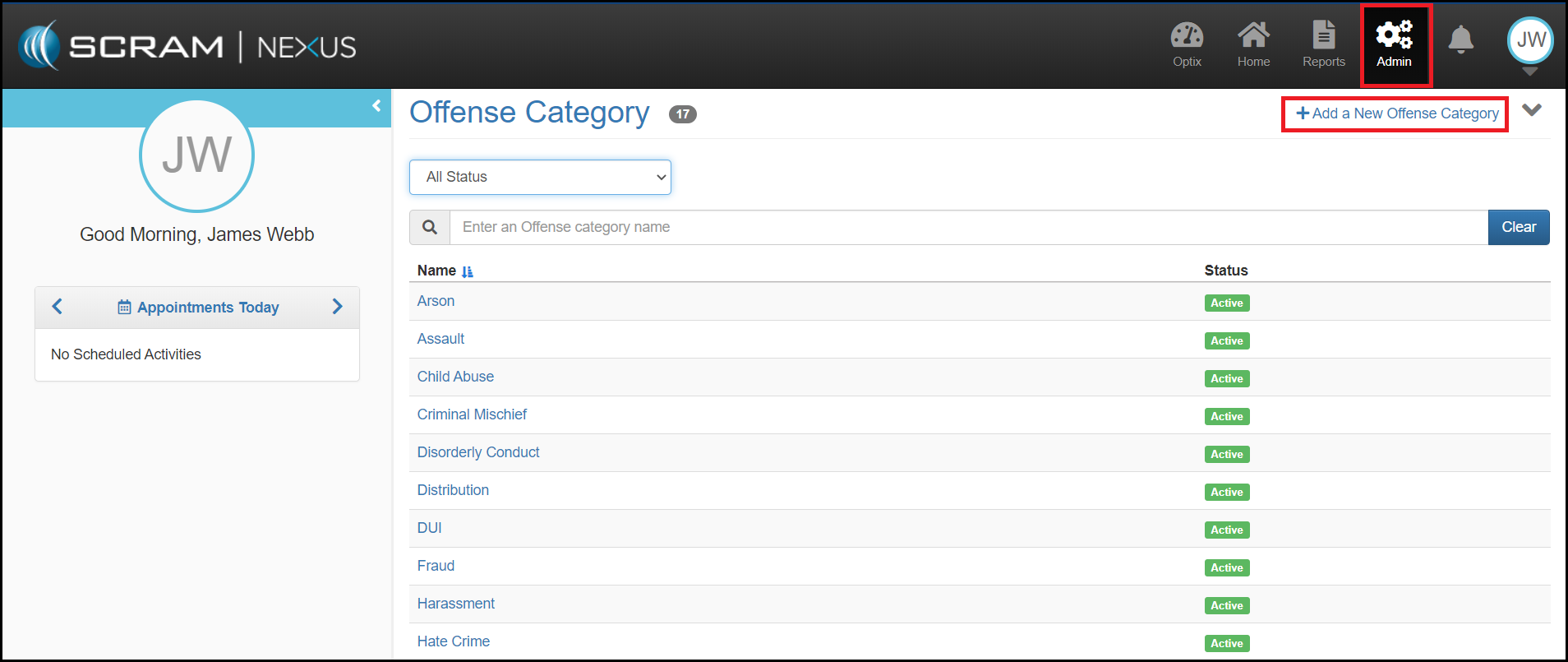 The Offense Category section provides the department with a catalog of offense types that can be uniquely set up and managed based on the departments preferred caseload descriptions. This feature can be used to provide a more detailed caseload description accessible through a client’s Court Case menuing that can subsequently be selected by officers to categorize and correlate clients with recommended target supervision models.