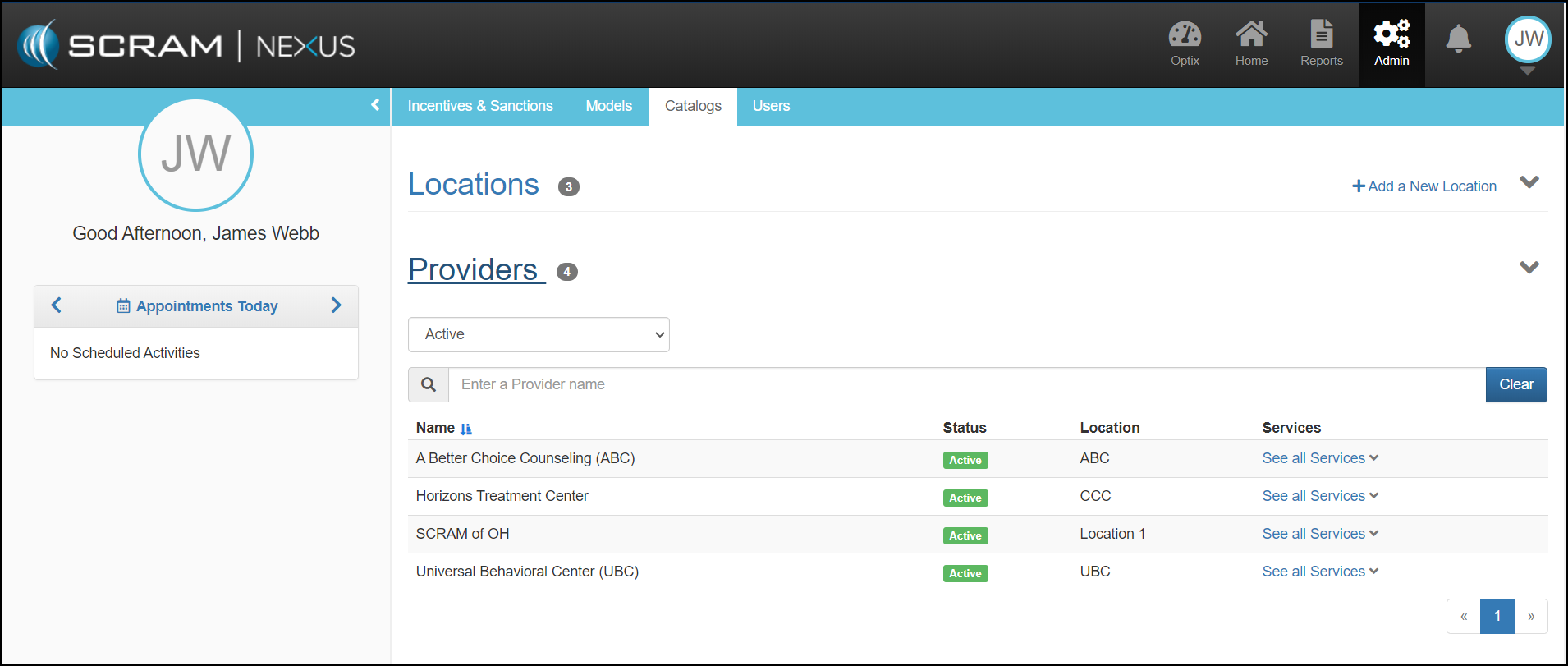The Providers section displays a list of providers for your Probation or Correction Department. This list provides the locations of the agency and what services they offer. To add a Provider, contact your Account Manager.