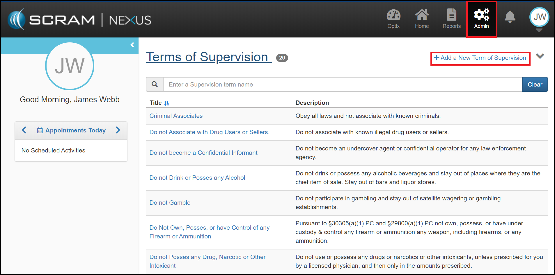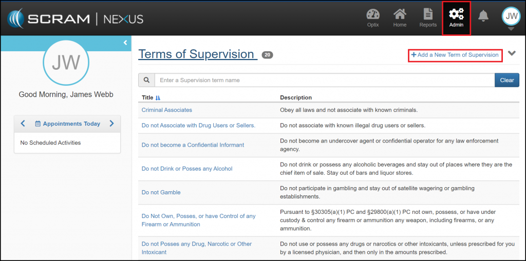 The Terms of Supervision section provides a catalog of Supervision Terms that are likely to be defined by the court. Their main use in Nexus is to provide the officer with a violation reason to document the on-demand sanctioning workflow.