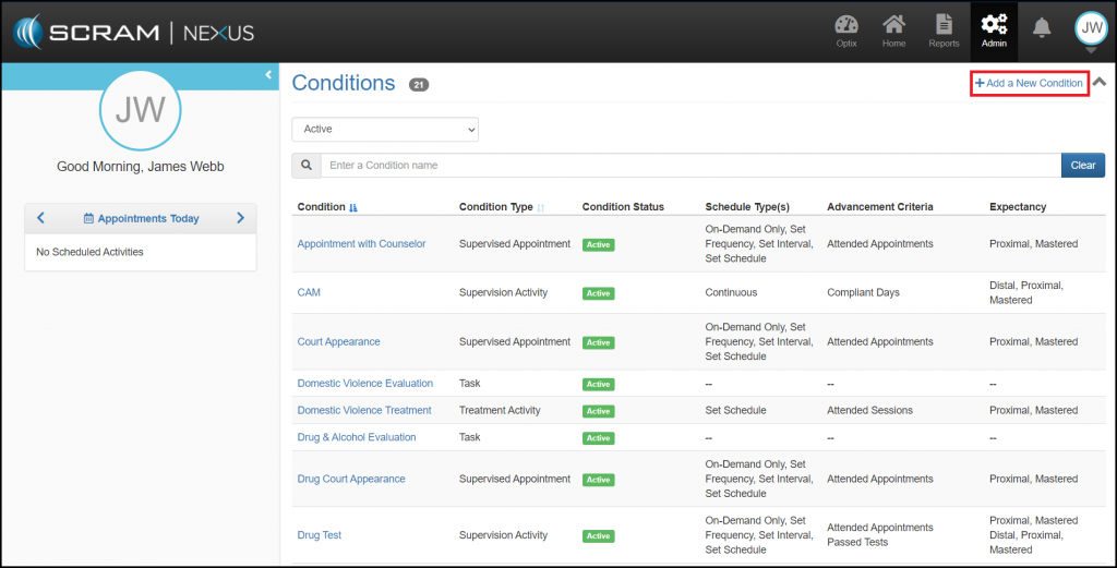 The Conditions library allows you to Add a New Condition and review a list of approved Conditions. The list represents the Activities that can be assigned to a Client through their Supervision Plan. When you select a condition name, you will be directed to the Conditions Details page where you can review or edit the specifics of the activity.  These conditions fall into five major areas: