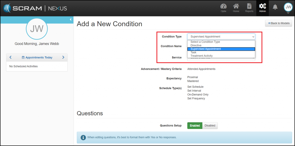 • Supervised Appointments: They include activities such as a Court Appearance or Review Hearing. When adding a Supervised Appointment, you can create unique question groups to be associated to the condition.
