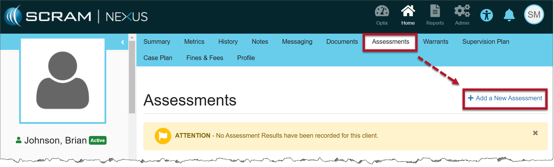1. Navigate to the client’s profile page in Nexus, choose the Assessments tab, and select the +Add a New Assessment hyperlink.