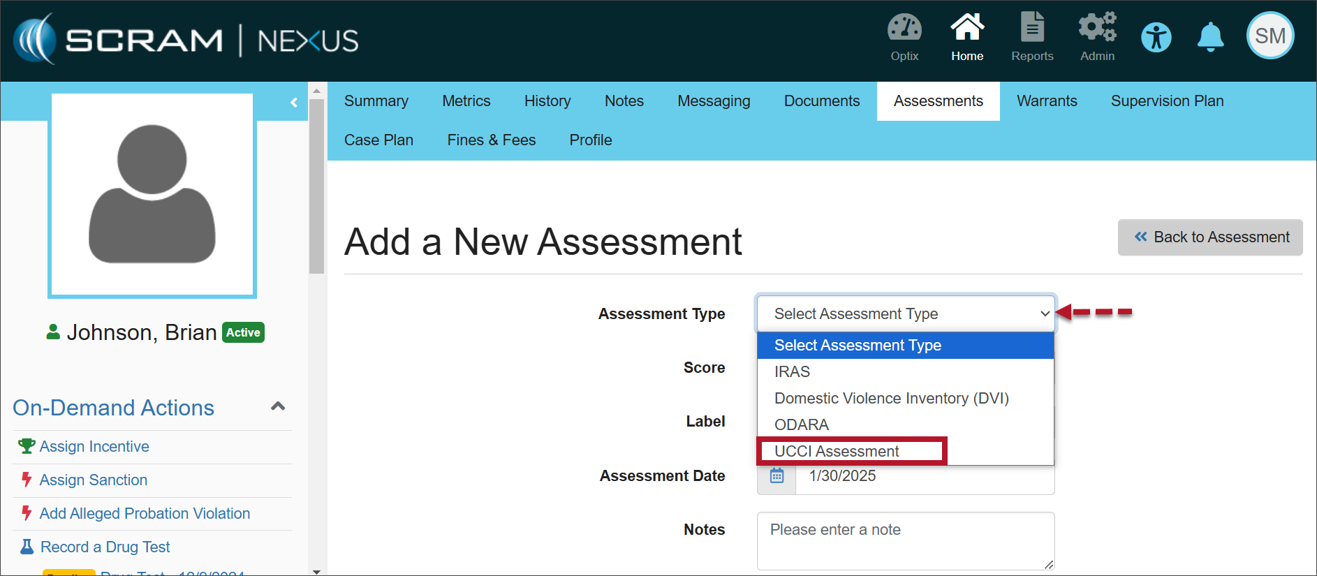2. On the Add a New Assessment page, select the Assessment Type dropdown menu, and then select the UCCI Assessment option.
