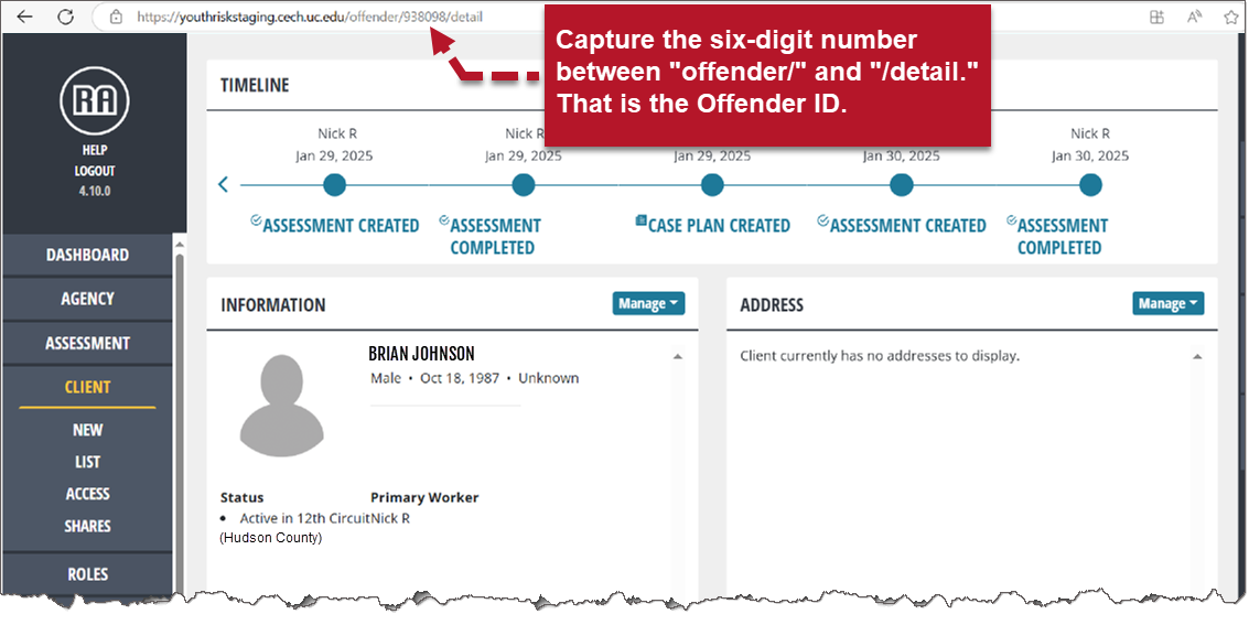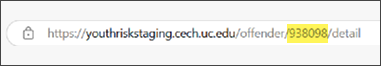 1. On the UCCI Assessment website, once you have created a client and completed an assessment for the client, the “Offender ID’” is found within the URL on the Client Detail page.