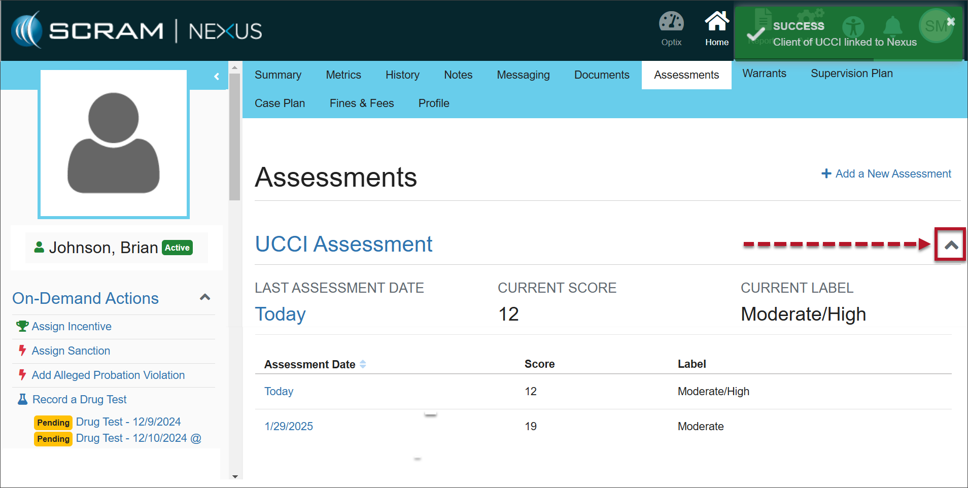 If your program utilizes a UCCI Assessment, once you have added that assessment to the client’s profile, the assessment results will automatically populate the client’s Assessments page.