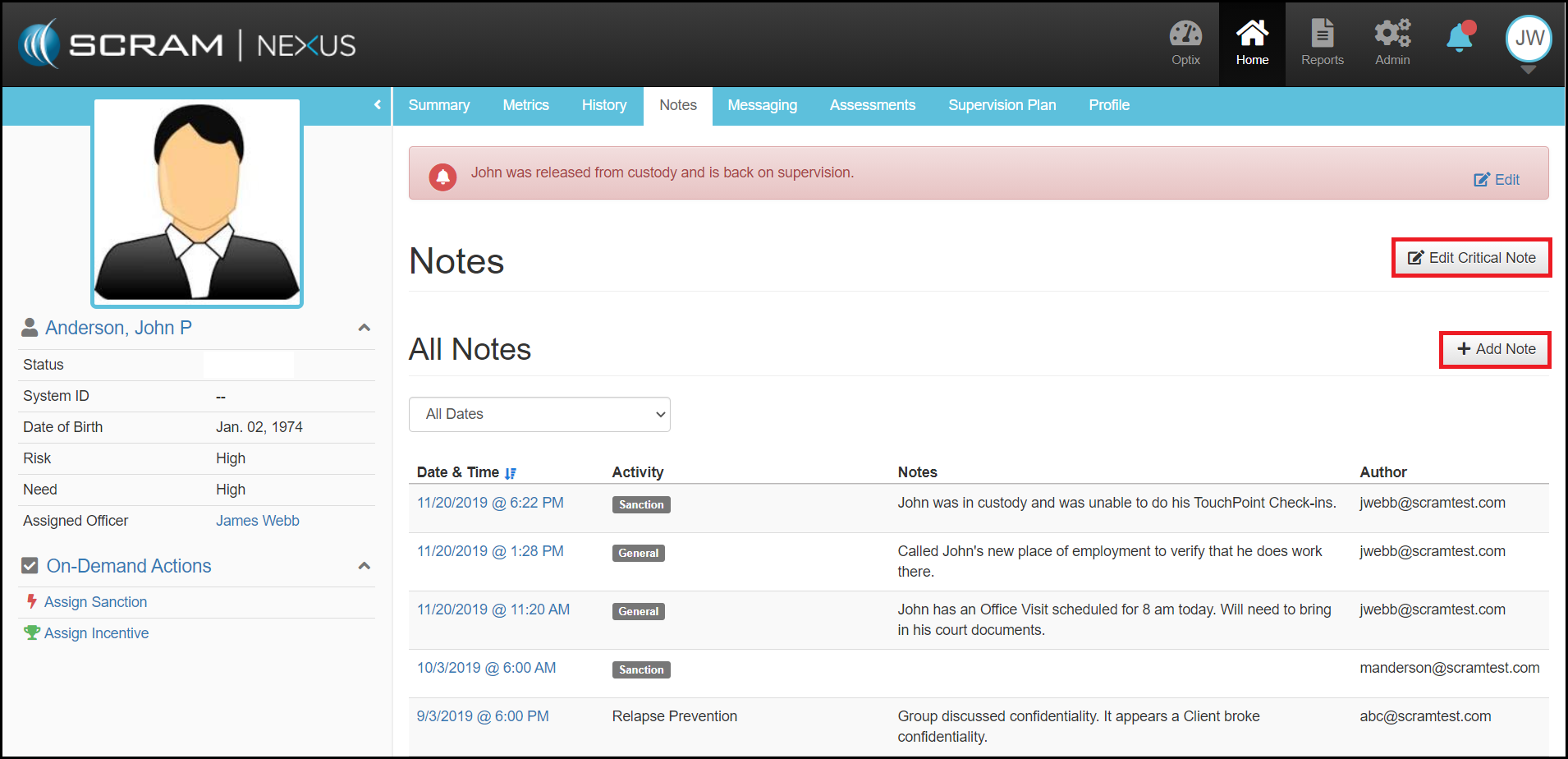 Notes within Nexus provides an officer the ability to capture any narrative that may help document a client’s individual case or their progress.