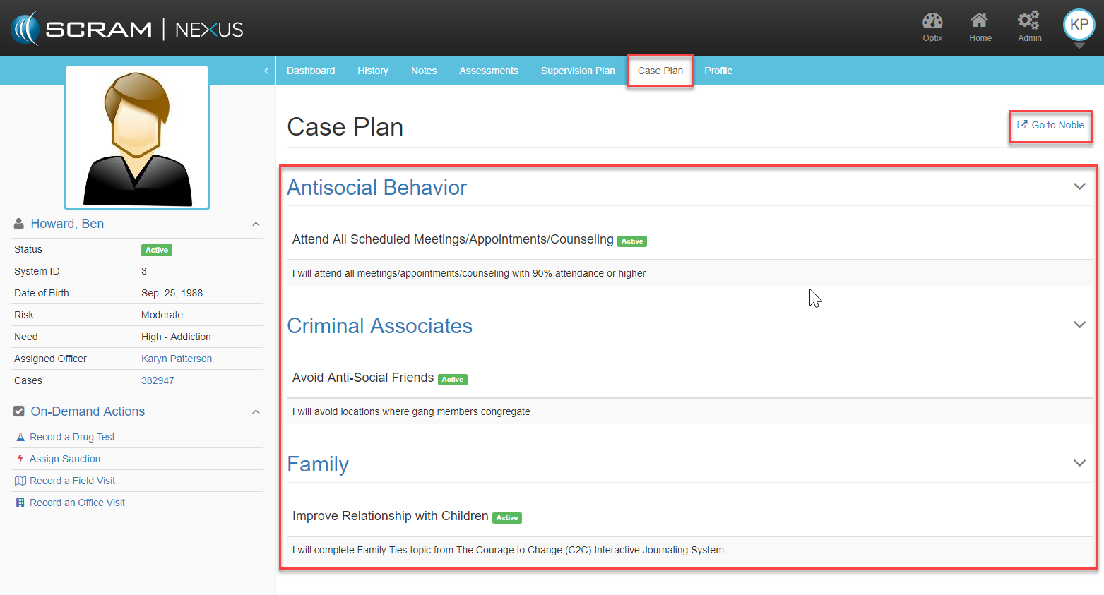 To review the Case Plan details from Noble, begin by selecting the client and click on the case plan menu tab. From there officers can review the top targeted goals and associated interventions.
