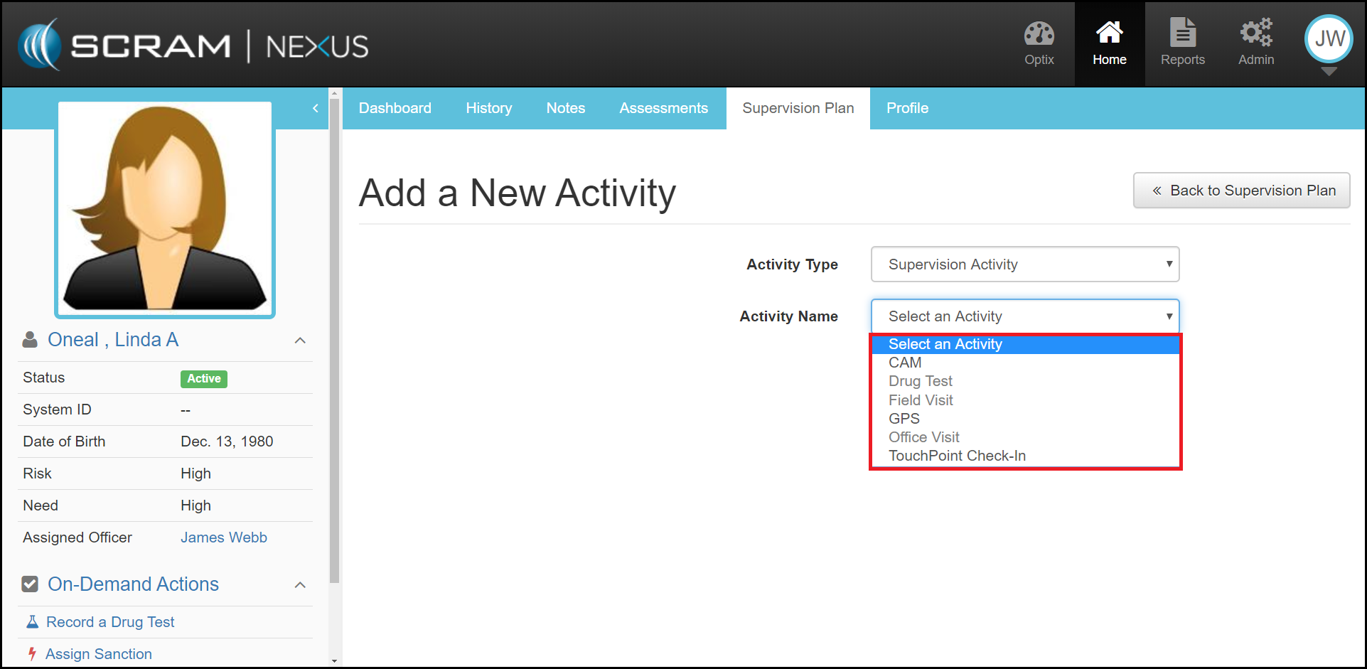 In Nexus, the supervision plan is made up of a range of unique activities that define a client’s behavioral expectations.  These can range from client- officer visits, treatment attendance, substance or sobriety testing, as well as, mobile or electronic monitoring.