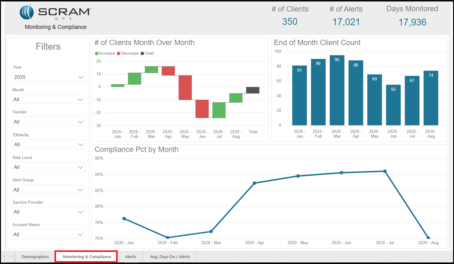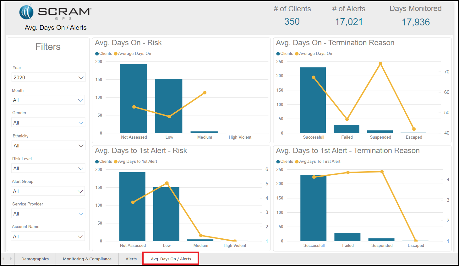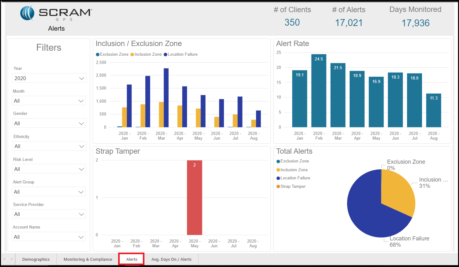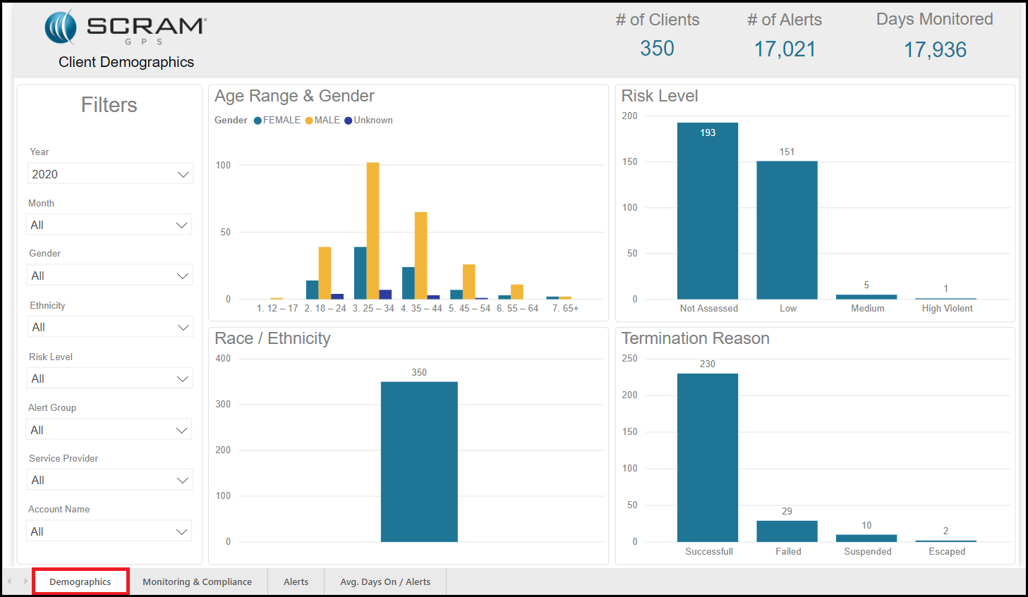 The Optix Analytics – GPS reports are designed to help you enhance your overall program by providing you with information on your client demographics, your compliance percentage, the amount and types of alerts that are being generated for your agency, and the average amount of days clients are on the program before the first alert is generated. Each report can be filtered to focus the data being displayed on each tile. This allows you to pinpoint the desired information and take a deeper dive into the data that are important to you.