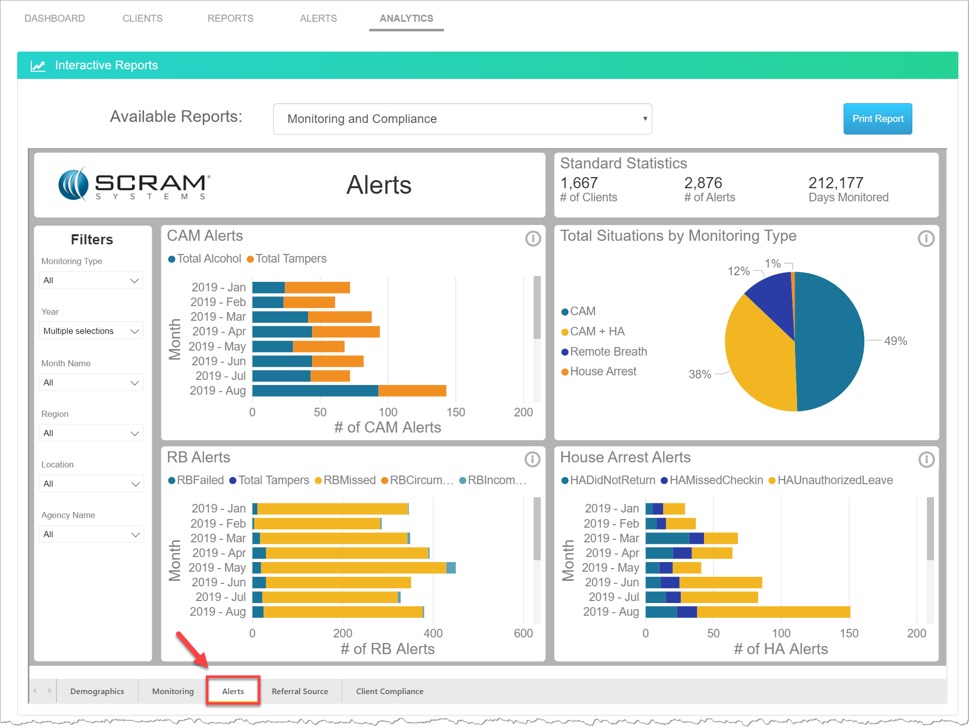 - Alcohol Compliance: Number of compliant vs. non-compliant clients by monitored day range and average number of violations.