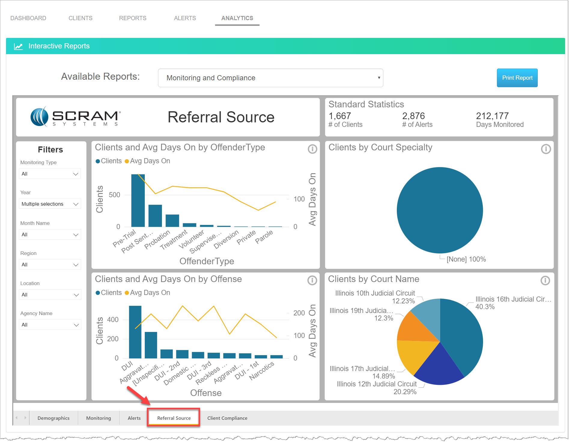 - Clients and Avg Days on by Offender Type: Bar graph displays the number of clients by offender type. The line graph displays the average days with active monitoring by offender type.