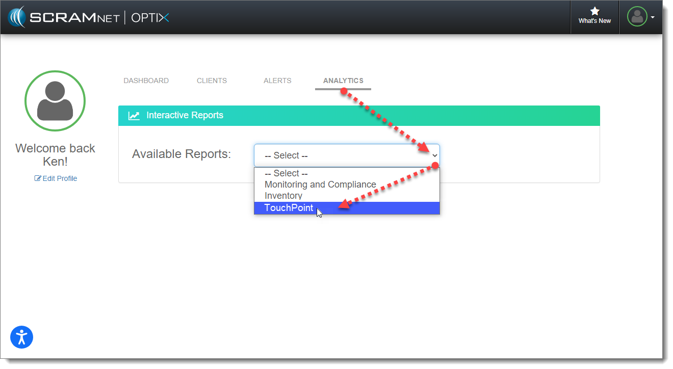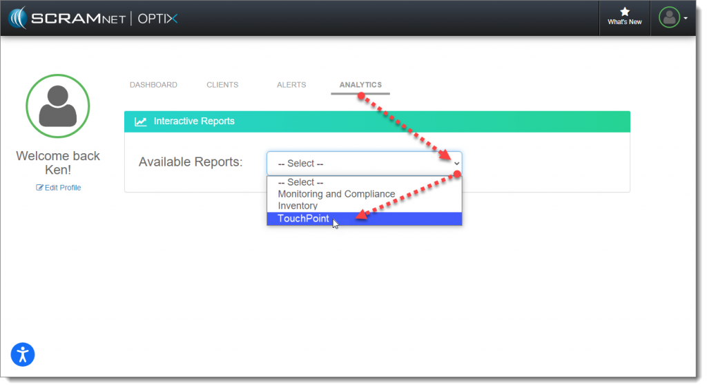 To access the report, select the Analytics tab on the SCRAM Optix home page, and then select “TouchPoint” from the Available Reports dropdown menu.