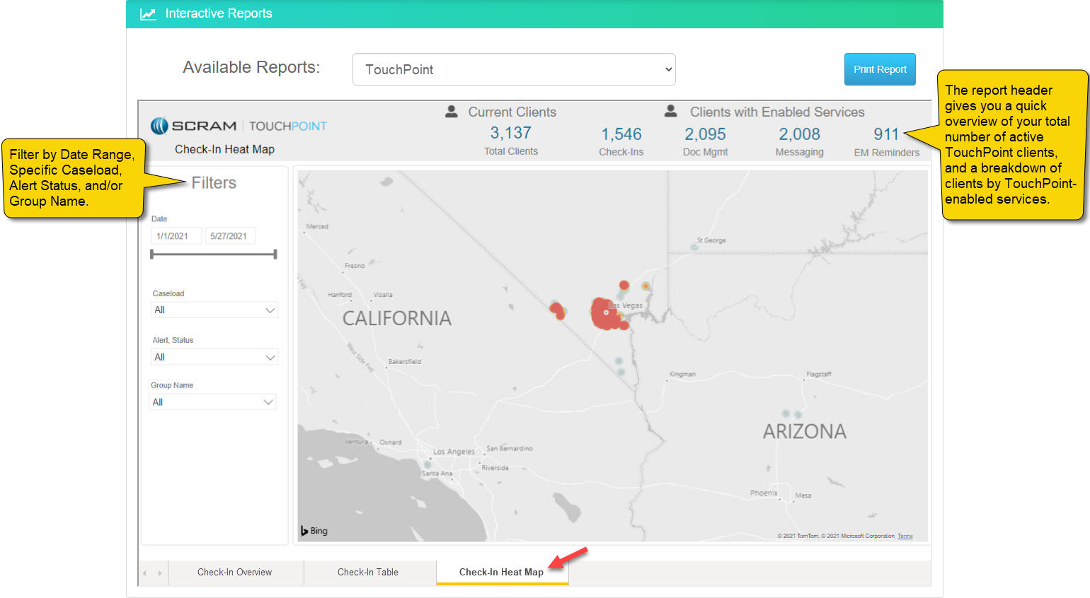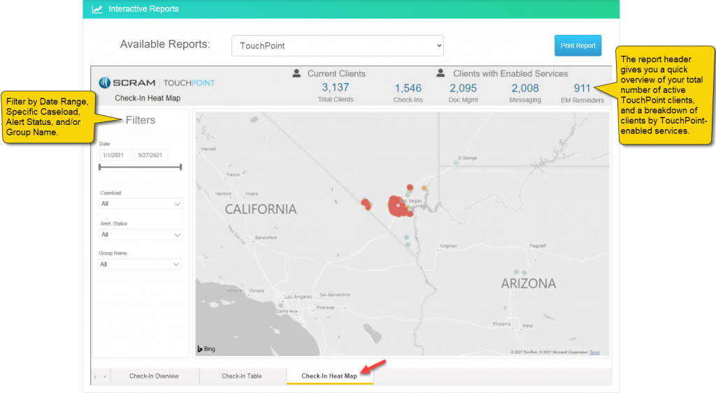 This TouchPoint report, located on the third of the three tabs across the bottom of the screen, provides you with a visual of the geographical locations (as determined by location services on your clients’ smartphones) from which the greatest concentration of your clients submit their TouchPoint check-ins. This report may also be filtered by Date Range, specific Caseload, Alert Status, and/or Group Name.