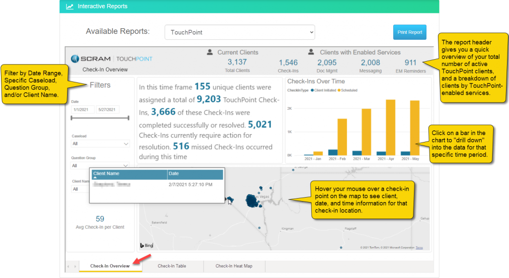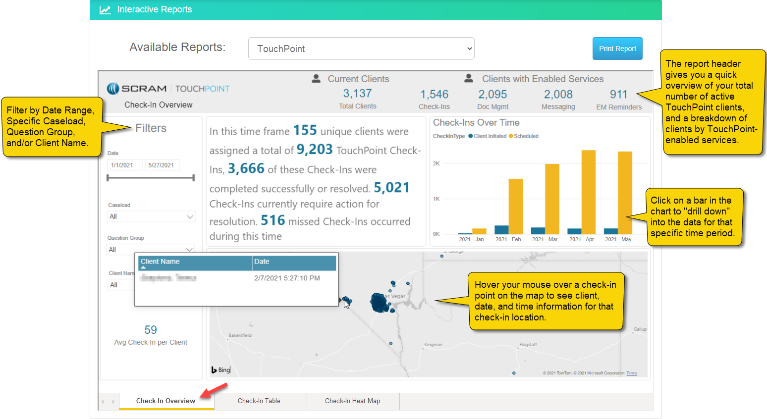This TouchPoint report, located on the first of the three tabs across the bottom of the screen, provides you with the total number of active TouchPoint clients, as well as a breakdown of clients by TouchPoint-enabled services, for a time period of your choosing. You may further filter the report by a specific Caseload, Question Group, and/or Client Name. Clicking on one of the bars in the bar graph tile allows you to “drill down” into the check-in data for that specific time period. Hovering your mouse over a check-in point on the map allows you to see client, date, and time information for that check-in location, via a floating pop-up window.