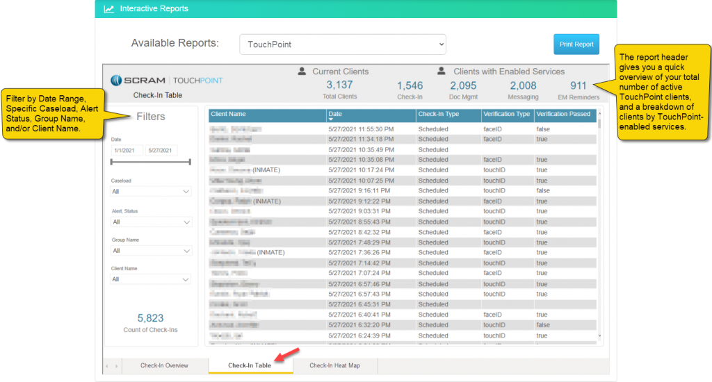 This TouchPoint report, located on the second of the three tabs across the bottom of the screen, also provides you with the total number of active TouchPoint clients, as well as a breakdown of clients by TouchPoint-enabled services, for the time period of your choosing, but presents the data in a table format rather than on a chart. This report also displays the verification method used by the client’s smartphone, and whether or not the check-in passed verification. You may further filter this report by a specific Caseload, Alert Status, Group Name, and/or Client Name.