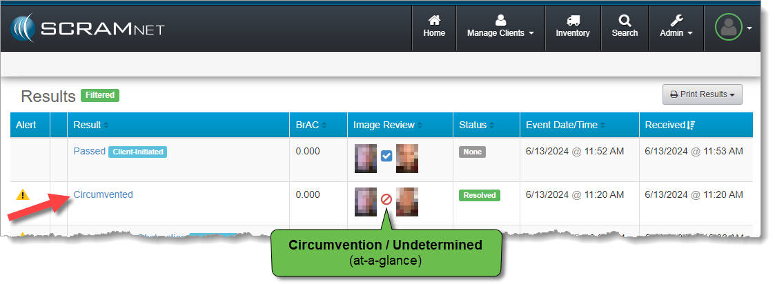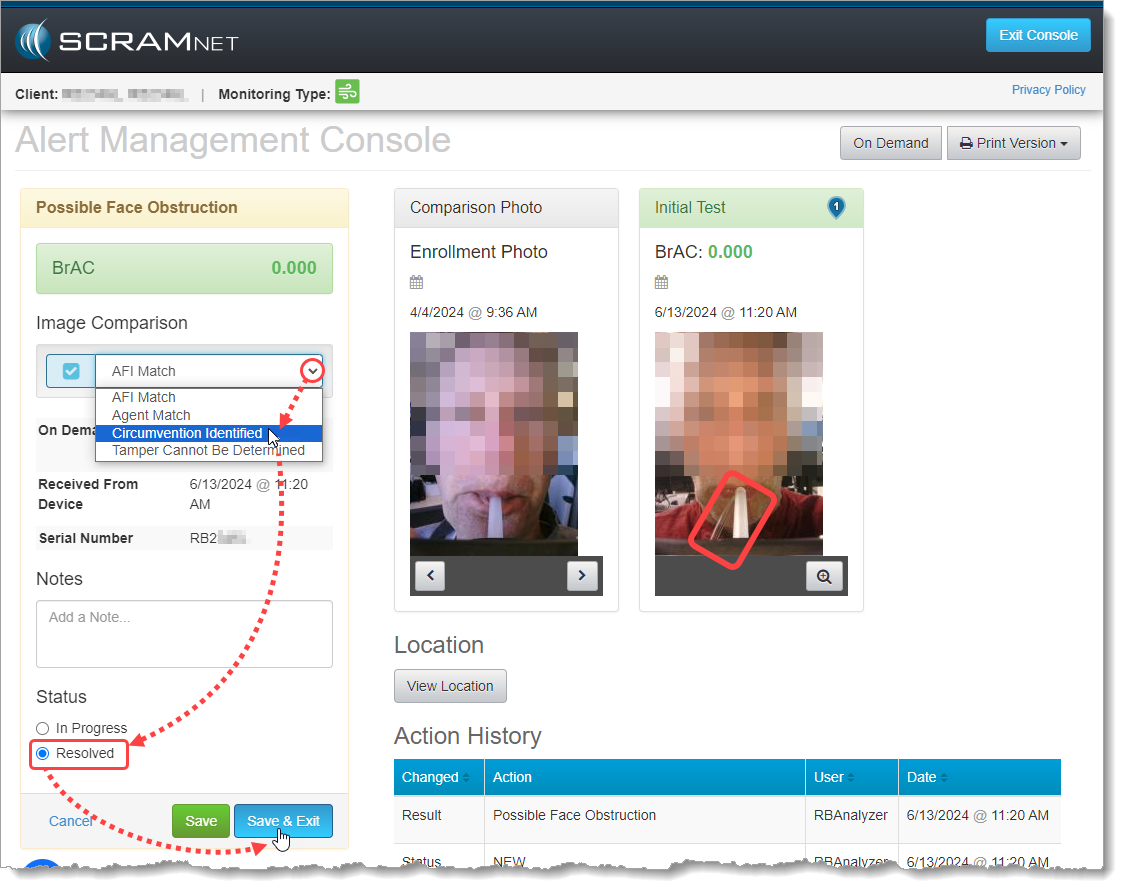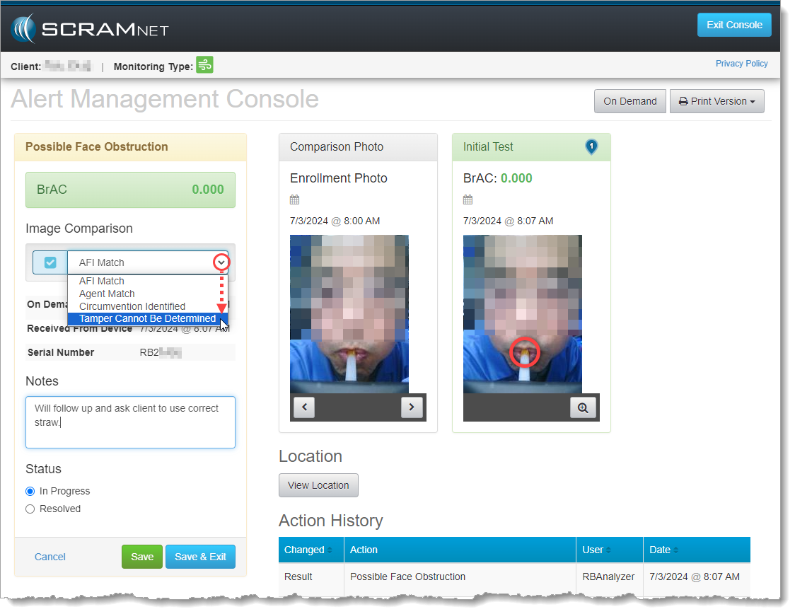 The SCRAMNET monitoring software has the ability to automatically detect irregularities with the RB Pro device’s breath tube in the breath test photo. This feature works much like Remote Breath Automatic Facial Intelligence (AFI), in that the system scans test result photos automatically and surfaces alerts to the RB Results page when a photo triggers the need for an agent to review the image.