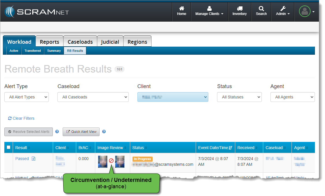 When you return to the SCRAMNET Workload RB Results page, you will note that the client’s breath test result has updated to “Passed,” because the BrAC was 0.000 and circumvention was not clear. The alert, however, remains In Progress because you have not resolved it yet. Your email address appears in the Status column along with the In Progress Status to indicate you are the agent working the alert.