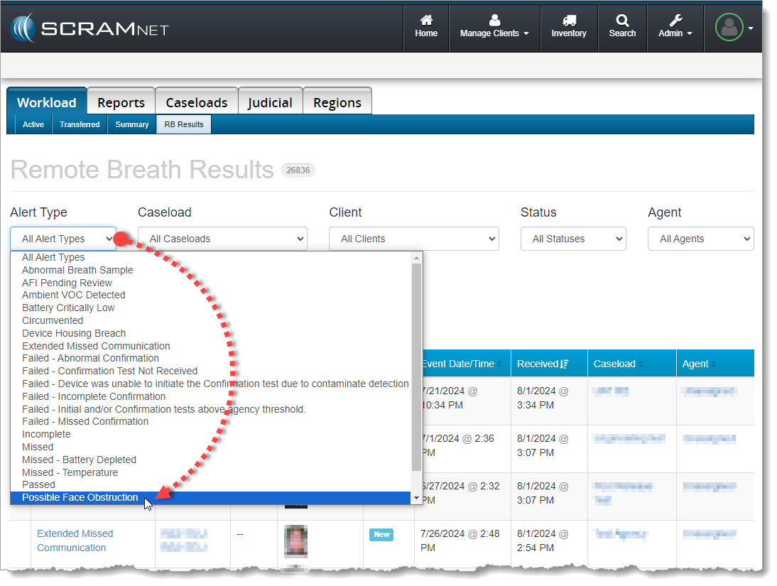 You may filter Remote Breath Results to see only these Alerts by selecting “Possible Face Obstruction” from the Alert Type filter dropdown menu: