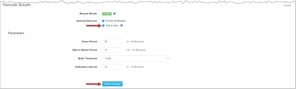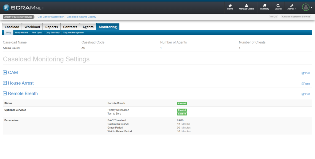 Once Test to Zero is enabled for your Caseload, for all breath testing clients who provide a “Failed” breath test alert, SCRAMNET will send the RB Pro device an On Demand breath test request 20 minutes after receiving the alert. SCRAMNET will continue to send On Demand breath test requests after each subsequent Failed alert every 20 minutes until the client’s breath test result is below the BrAC threshold for the Caseload.