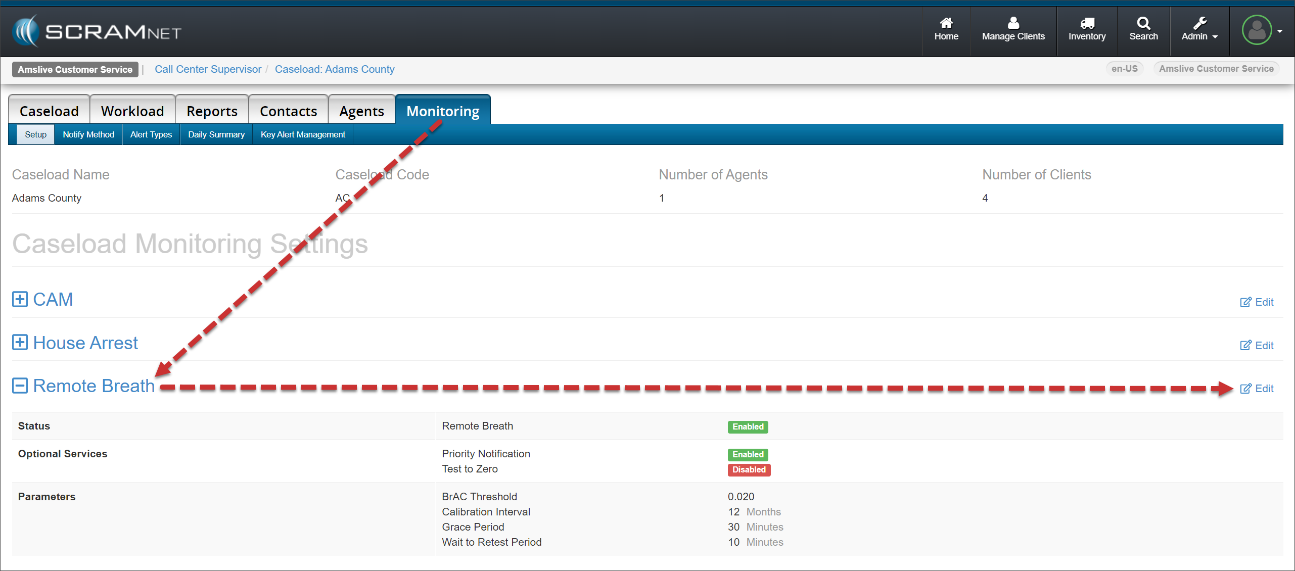 - Locate the Remote Breath section and select the Edit hyperlink.