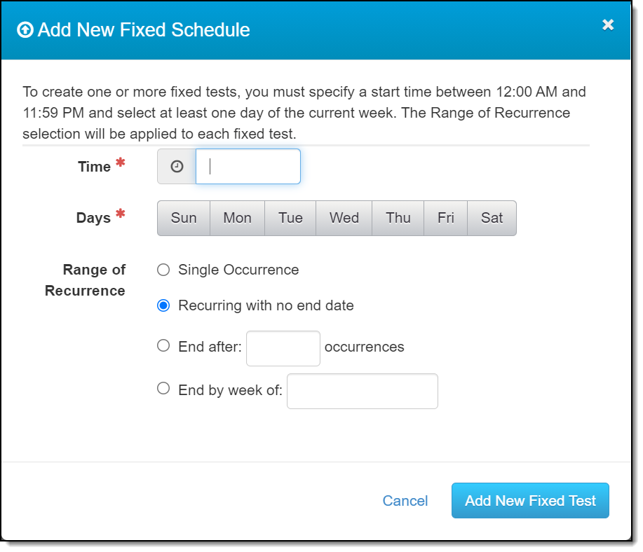 - If a fixed test is meant to be a single occurrence, click the Fixed button, and select the Single Occurrence radio button.