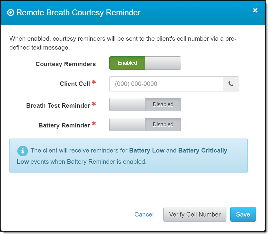 - A courtesy reminder is a text message that can be sent to the client’s cell phone to remind the client that a scheduled test must be performed.