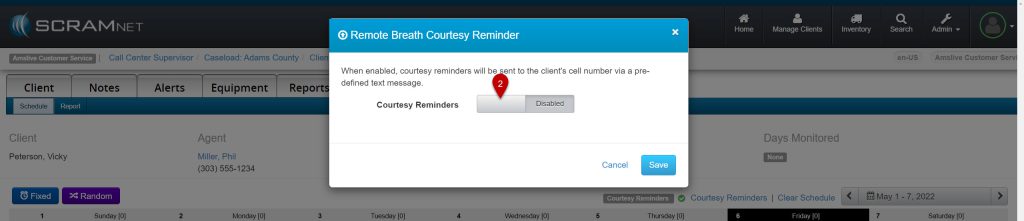 - In the Remote Breath Courtesy Reminder pop-up, toggle the Disabled button to Enabled.